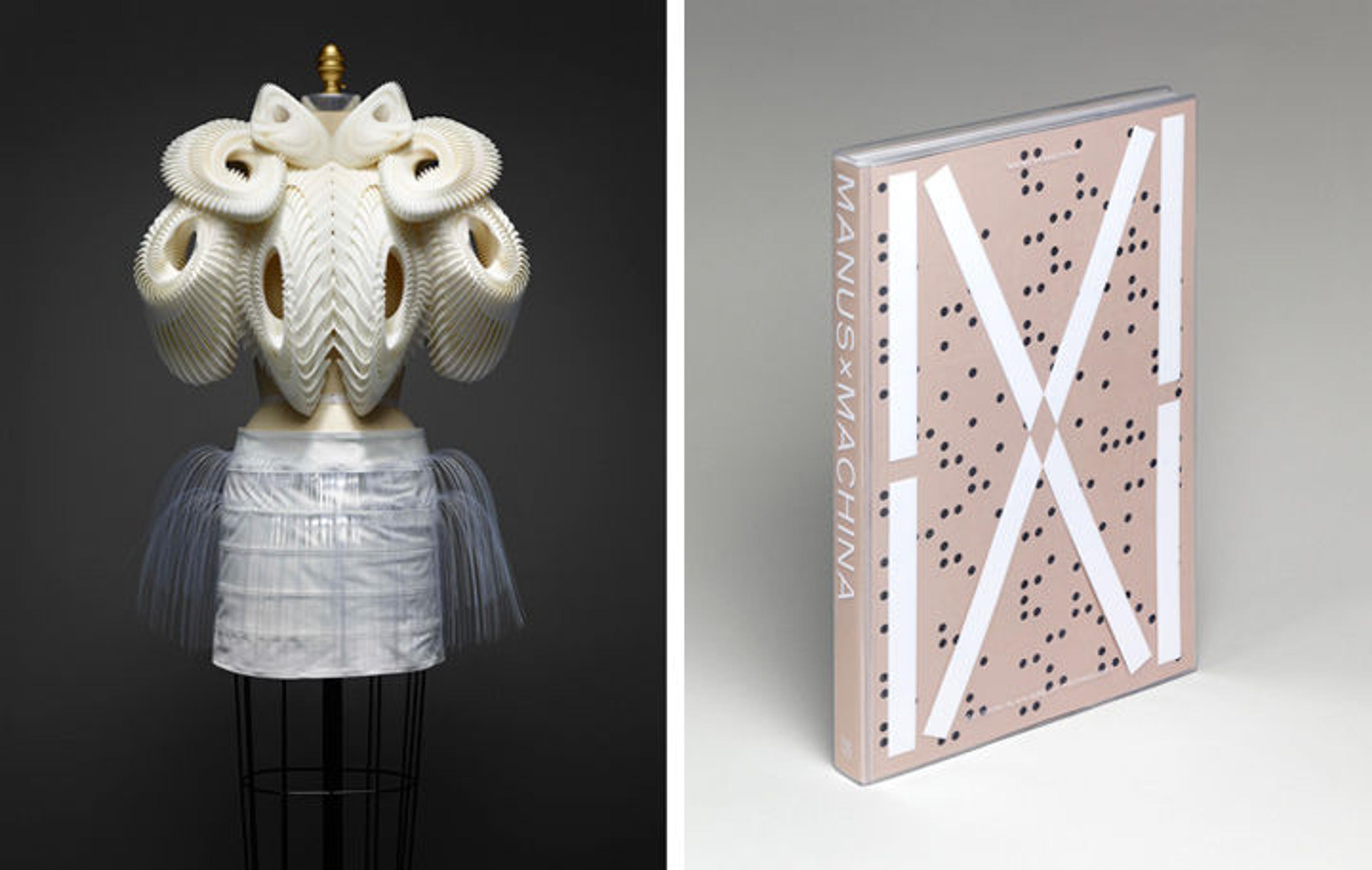 «The exhibition Manus × Machina: Fashion in an Age of Technology, open through August 14, 2016, traces the evolution of fashion from the founding of the haute couture through the onset of industrialization and mass production to the present day, when designers employ technologies such as 3D printing, laser cutting, and computer-generated weaving and patterns to create high fashion. In a similar vein, the exhibition catalogue pushes the limits of contemporary book design and production and, like the fashions in the show, uses a striking mix of hand ("manus") and machine ("machina") techniques.»