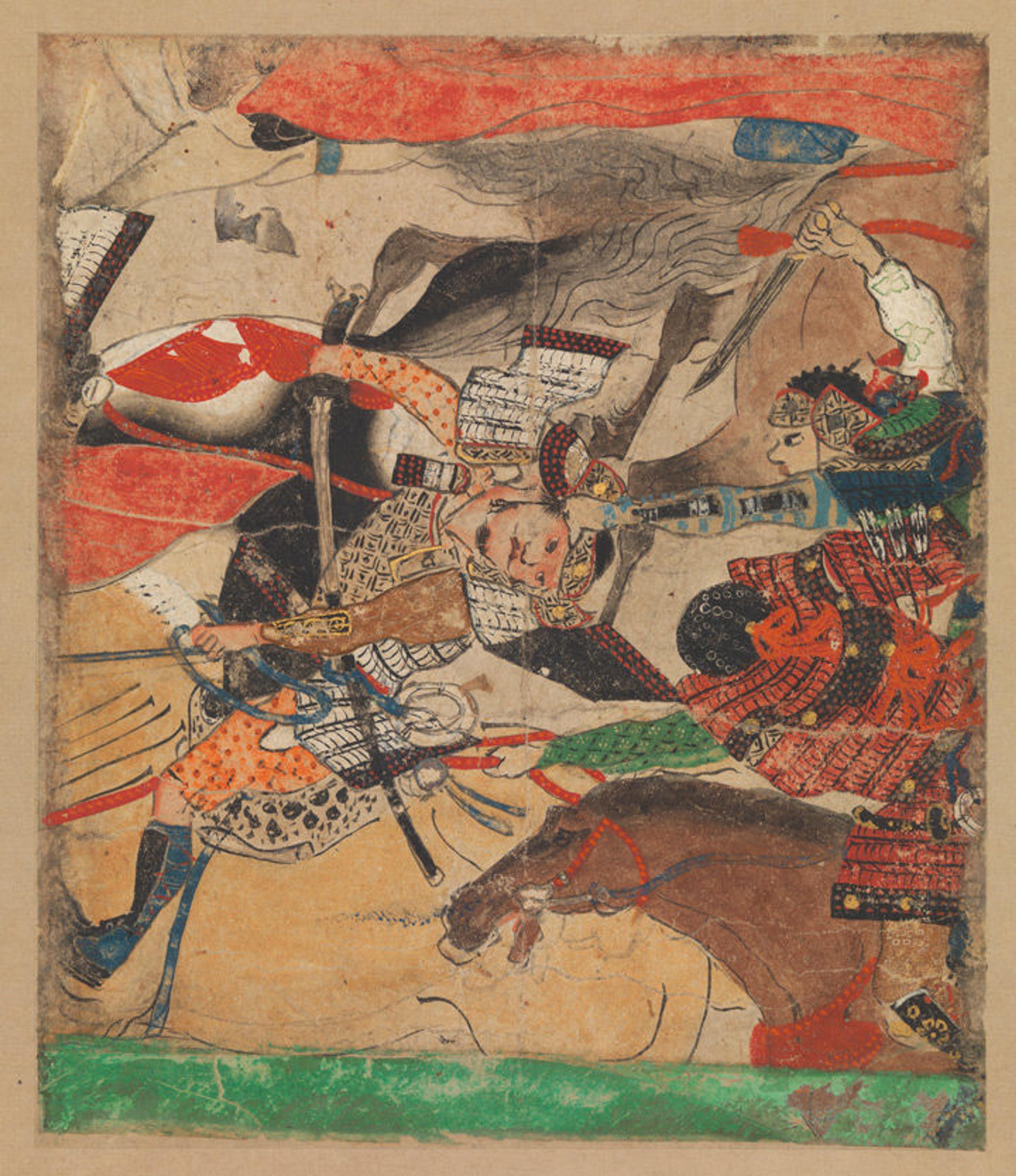 Battle at Rokuhara, from The Tale of the Heiji Rebellion (Heiji monogatari), first quarter of the 14th century. Kamakura period (1185–1333). Handscroll fragment mounted as hanging scroll; ink and color on paper; Image: 6 13/16 x 5 11/16 in. (17.3 x 14.5 cm), Overall with mounting: 50 5/16 x 15 1/16 in. (127.8 x 38.2 cm), Overall with knobs: 50 5/16 x 16 7/8 in. (127.8 x 42.8 cm). The Metropolitan Museum of Art, New York, Mary Griggs Burke Collection, Gift of the Mary and Jackson Burke Foundation, 2015 (2015.300.20)