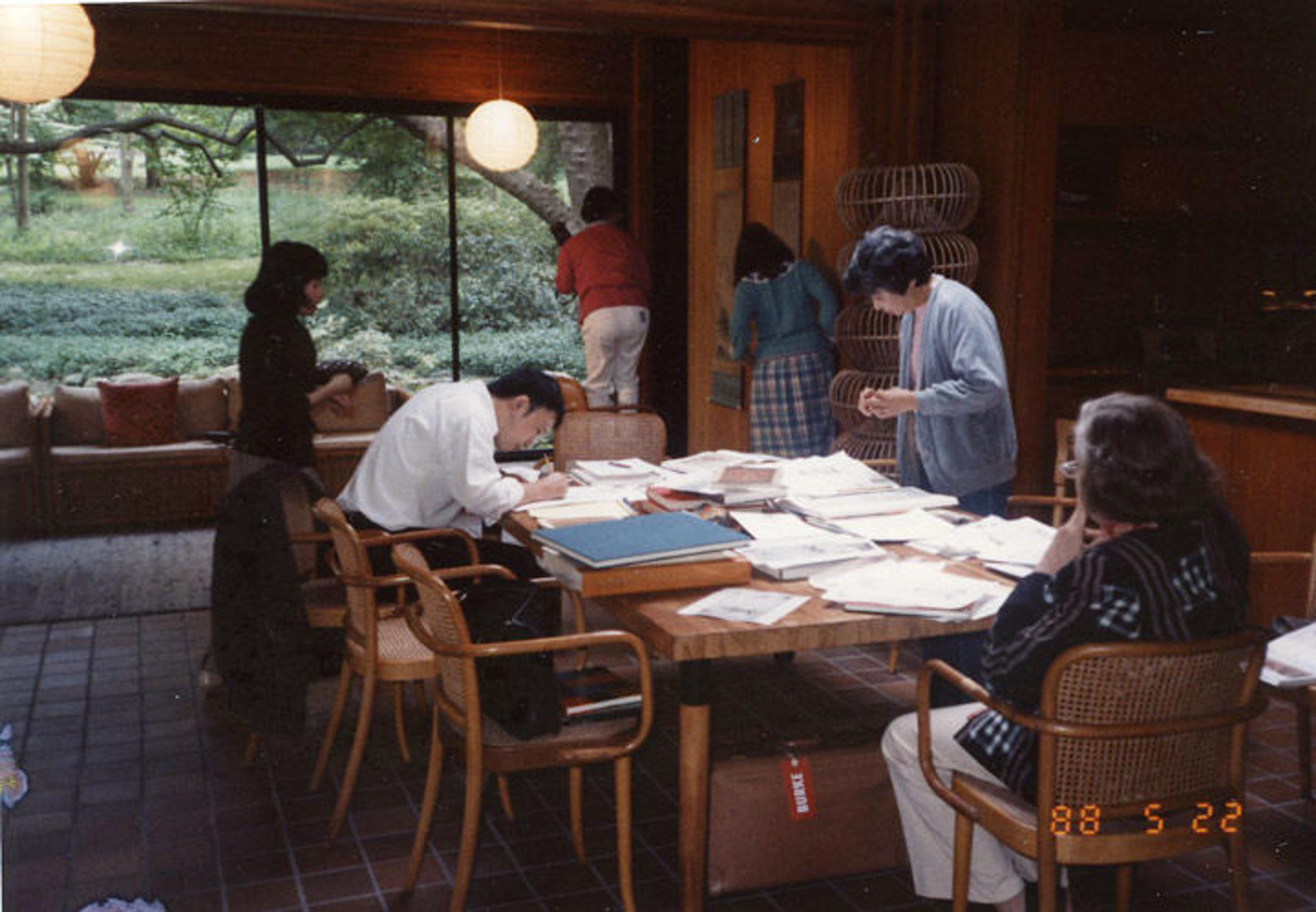 Professor Miyeko Murase and Columbia graduate students studying as Mary Griggs Burke looks on. Oyster Bay, Long Island, May 22, 1988. Mary Griggs Burke papers