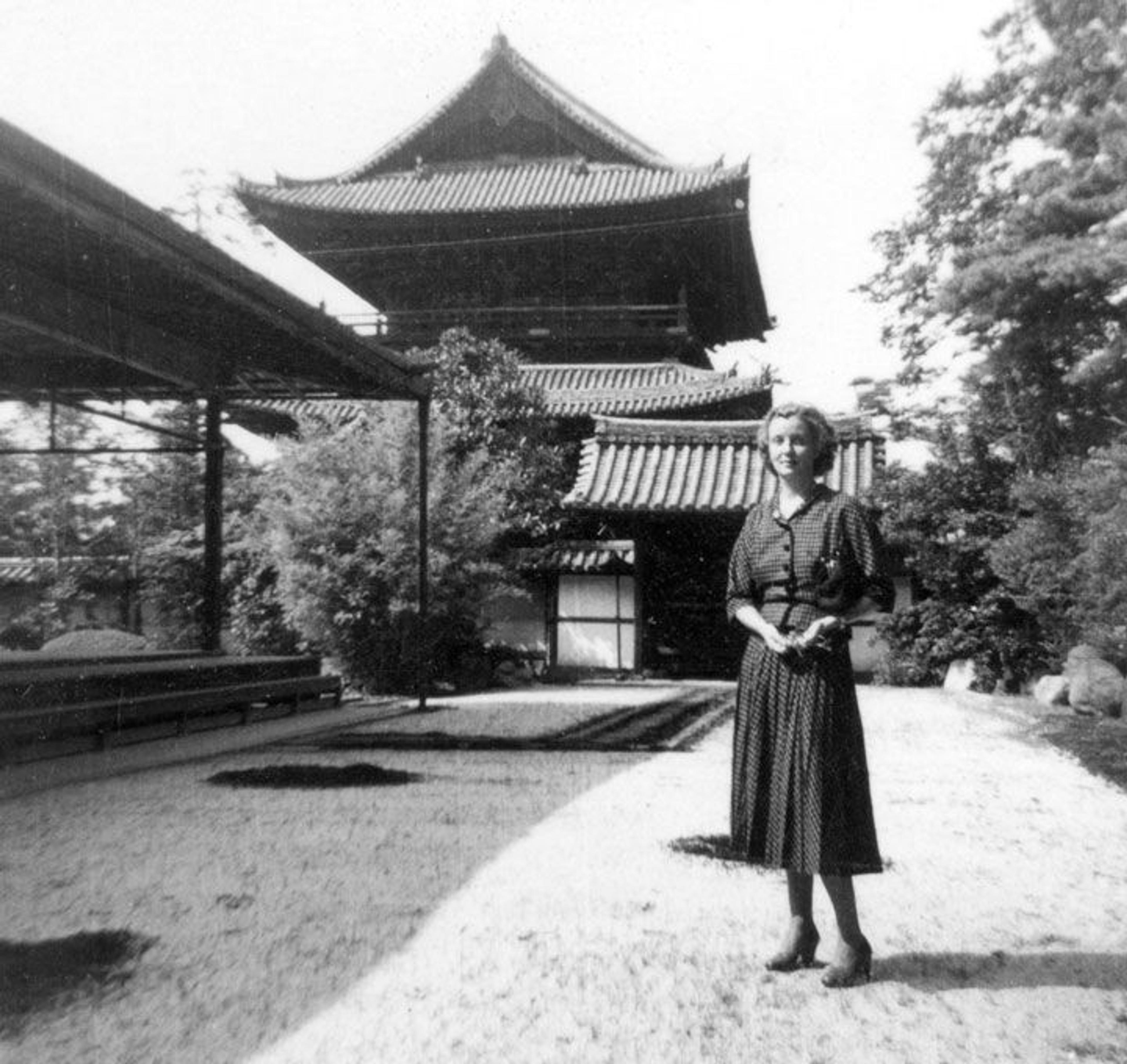 Mary Griggs Burke in front of the Kiyomizu-dera Temple during her first trip to Japan, August 16, 1954. Mary Griggs Burke papers