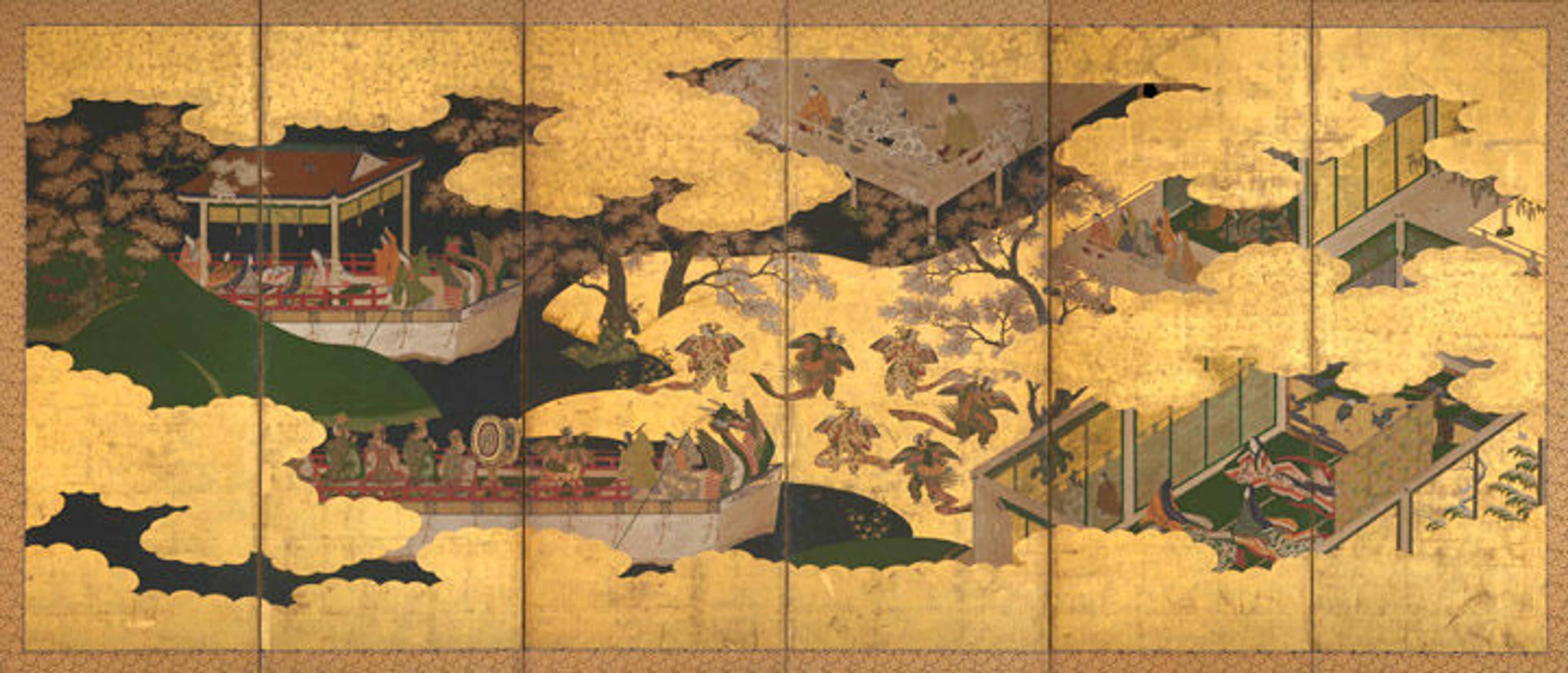 "Butterflies" ("Kochō"), Chapter 24 from The Tale of Genji (Genji monogatari). Momoyama period (1573–1615). Six-panel folding screen; ink, color, gold, and gold leaf on paper; 65 in. x 12 ft. 3/4 in. (165.1 x 367.7 cm). The Metropolitan Museum of Art, New York, Mary Griggs Burke Collection, Gift of the Mary and Jackson Burke Foundation, 2015 (2015.300.32)