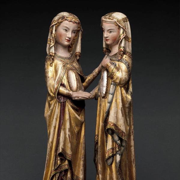 Attributed to Master Heinrich of Constance (German, active in Constance, ca. 1300). The Visitation, ca. 1310–20. Walnut, paint, gilding, rock-crystal cabochons inset in gilt-silver mounts, 23 1/4 × 11 7/8 × 7 1/4 in. (59.1 × 30.2 × 18.4 cm). The Metropolitan Museum of Art, New York, Gift of J. Pierpont Morgan, 1917 (17.190.724)