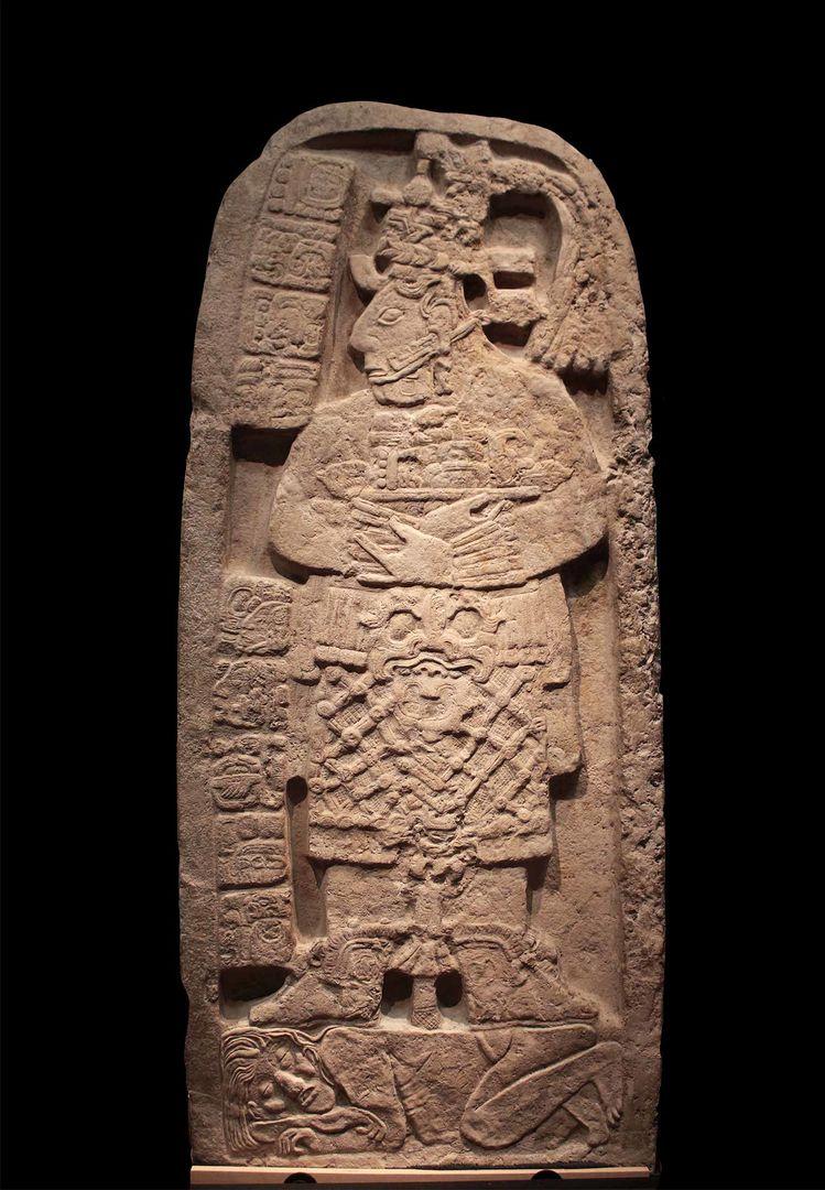Portrait of a queen regent trampling a captive (Stela 24). Unrecorded Maya artists, Sa’aal (Naranjo, Guatemala). January 22, A.D. 702, Maya date: 9.13.10.0.0 7 Ajaw 3 K’umk’u. Limestone. Lent by the Republic of Guatemala in celebration of the Bicentennial of Independence, 2021 (L.2021.28.1). MUNAE 15213, Registro 1.1.1.11100. Courtesy Ministerio de Cultura y Deportes de Guatemala. © Archivo Digital MUNAE