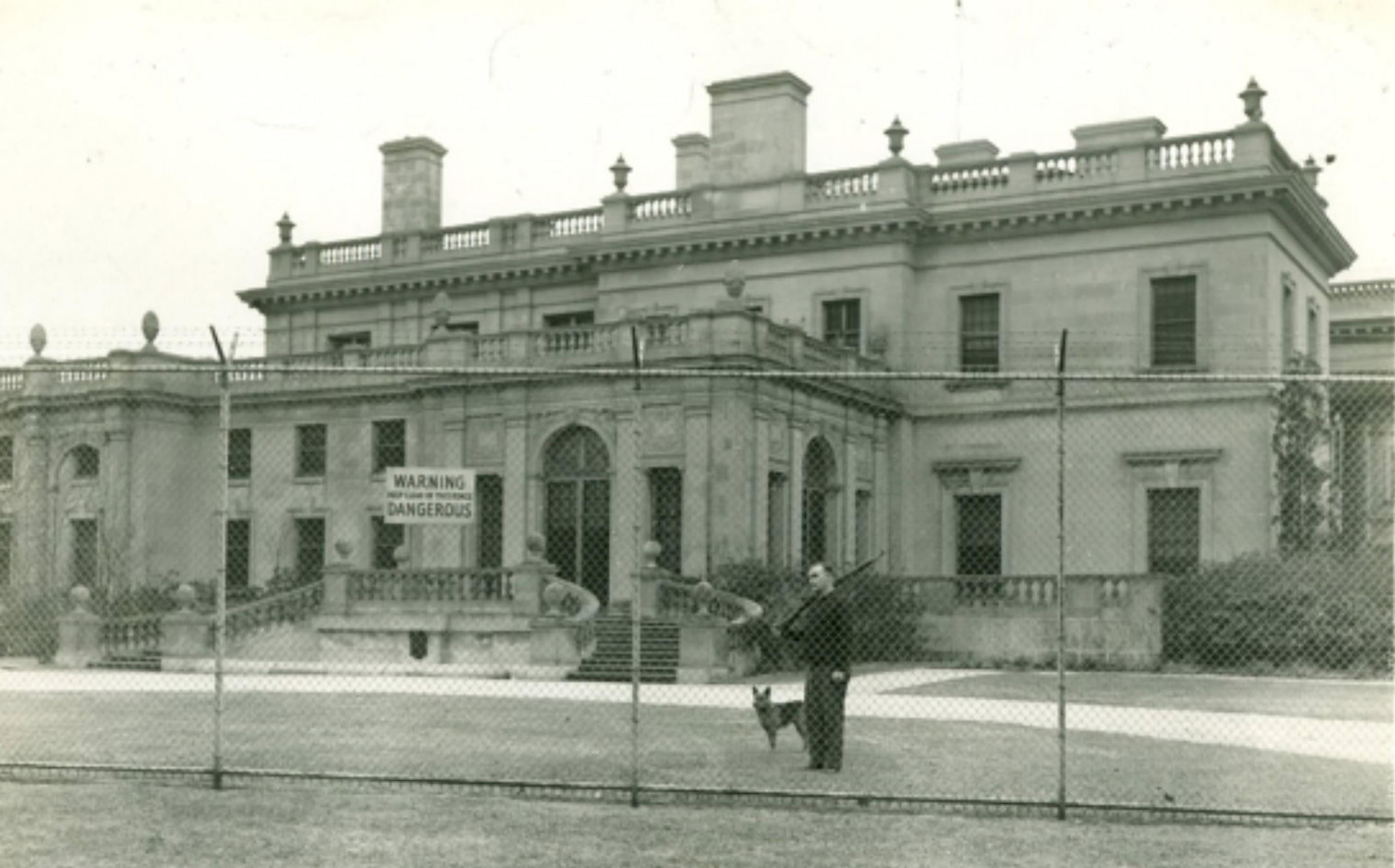 A steel-mesh-and-barbed-wire fence surrounded the building, seen here, perhaps, with the watchdog named Peggy.