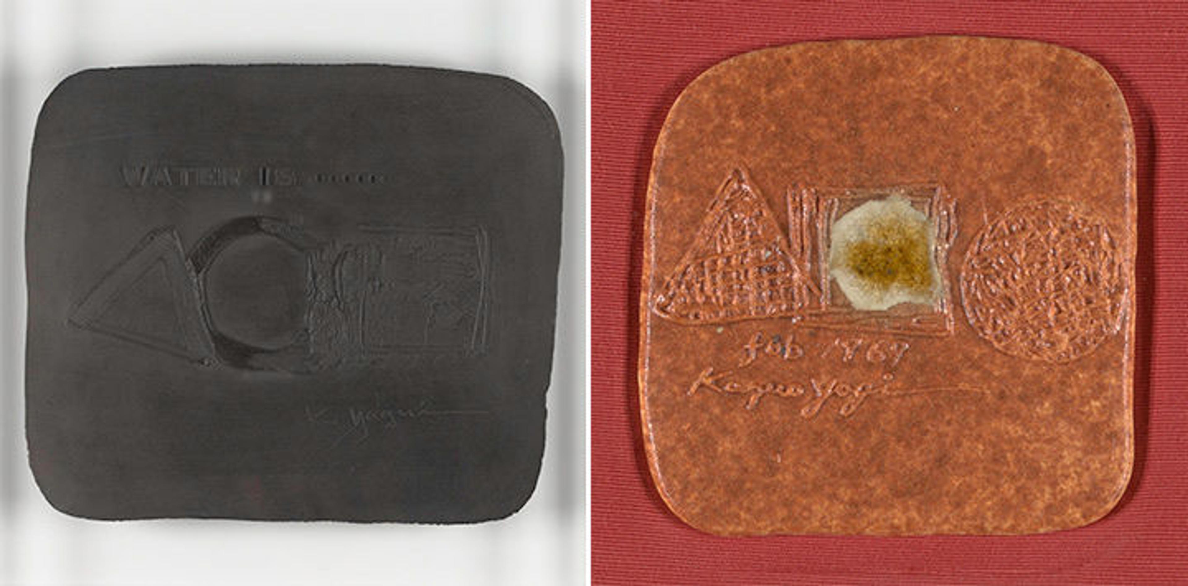 Left: Framed version of the ceramic plate piece Water Is . . . (detail), included in 八木一夫作品集 : 陶板付特裝本 (Yagi Kazuo sakuhinshū: tōban tsuki tokusōbon, "The Collected Works of Yagi Kazuo: Special Edition with Ceramic Plate"). Tōkyō: Kōdansha, 1980. Watson Library copy: Gift of Halsey and Alice North. Right: Detail of the medallion-sized version of Water Is . . ., attached to the cover of 八木一夫作品集 (Yagi Kazuo sakuhinshū, "The Collected Works of Yagi Kazuo"). Tōkyō: Kyūryūdō, 1969. Watson Library copy: Gift of Halsey and Alice North