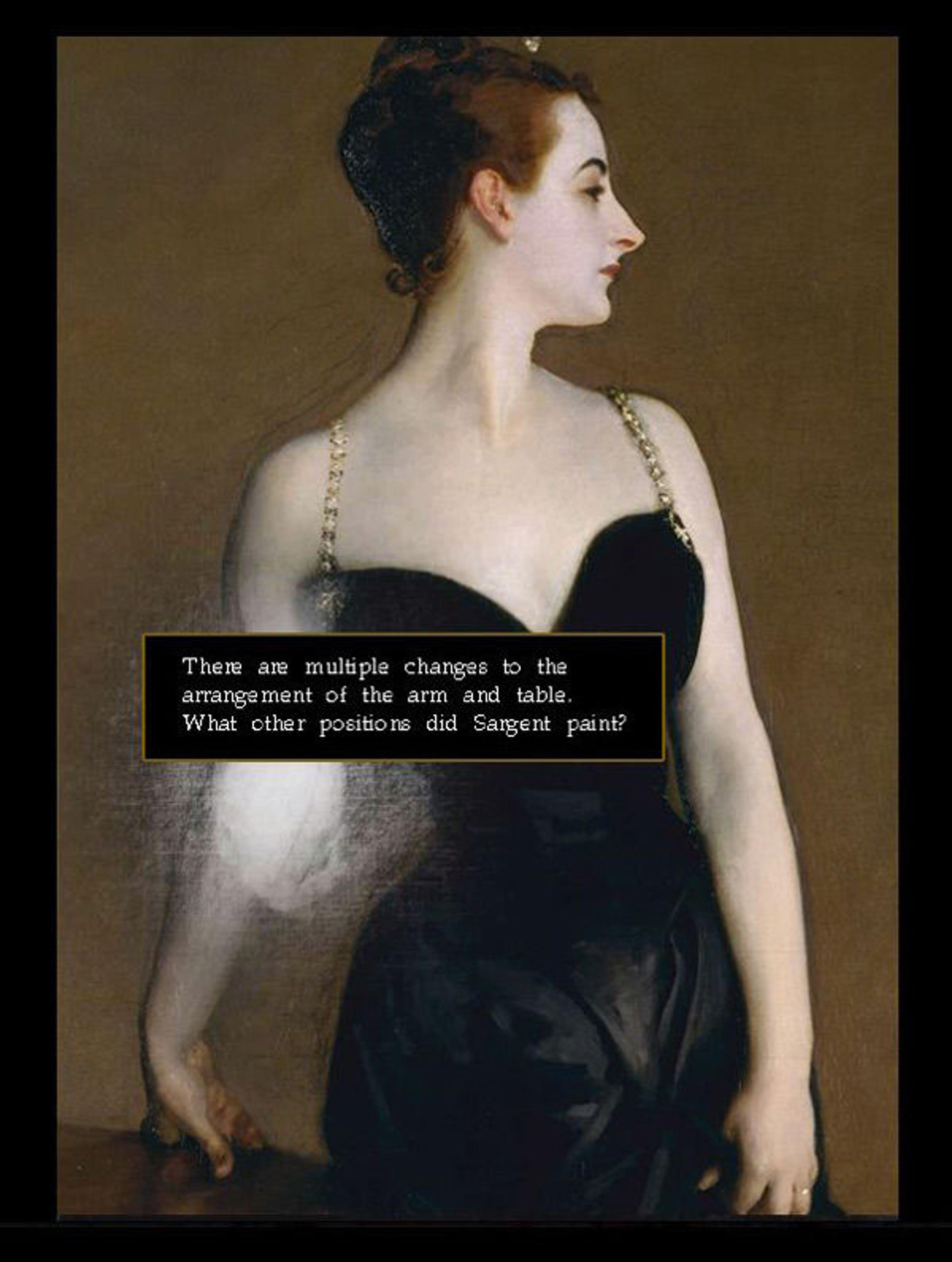 This idea was inspired by my childhood dream of becoming an archaeologist; by using a flashlight, users can "role-play" as archaeologists or researchers. I wanted to experiment with physical movement rather than creating a touch-based or mouse-based application. The portrait of Madame X is nearly eight-feet tall, and in an ideal scenario, the digital version of the painting would be projected at the same size as the original. By prompting the user to move their arms in order to examine the painting, the interaction emphasizes the portrait's size.