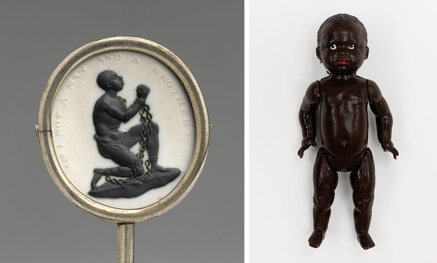 Left: Manufacturer: Josiah Wedgwood (British, 1730–1795). Modeler: William Hackwood (British, ca. 1753–1836). Antislavery medallion, ca. 1787. Jasperware, overall: 1 3/16 x 1 1/16 in. (3 x 2.7 cm). The Metropolitan Museum of Art, New York, Gift of Frederick Rathbone, 1908 (08.242). Right: Patrick Kelly (American, 1954–1990). Pin, late 1980s. Plastic. The Metropolitan Museum of Art, New York, Gift of Kathryn Sermak, 1995 (1995.577.7)