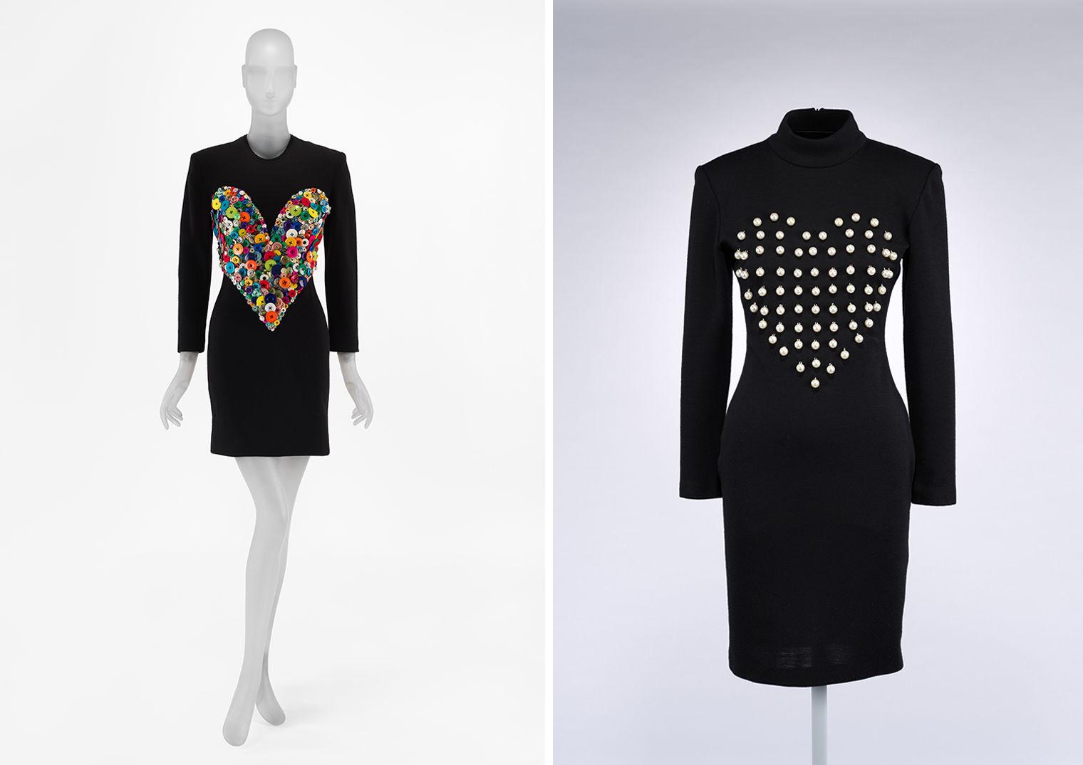 Left: Patrick Kelly (American, 1954–1990). Dress, fall/winter 1986–87. Wool, plastic. The Metropolitan Museum Museum of Art, New York, Gift of Elaine Blatt, 2005 (2005.92). Right: Patrick Kelly (American, 1954–1990). Dress, ca. 1988. Wool, acrylic, metal. The Metropolitan Museum of Art, New York, Purchase, Millia Davenport and Zipporah Fleisher Fund, 2021 (2021.51)
