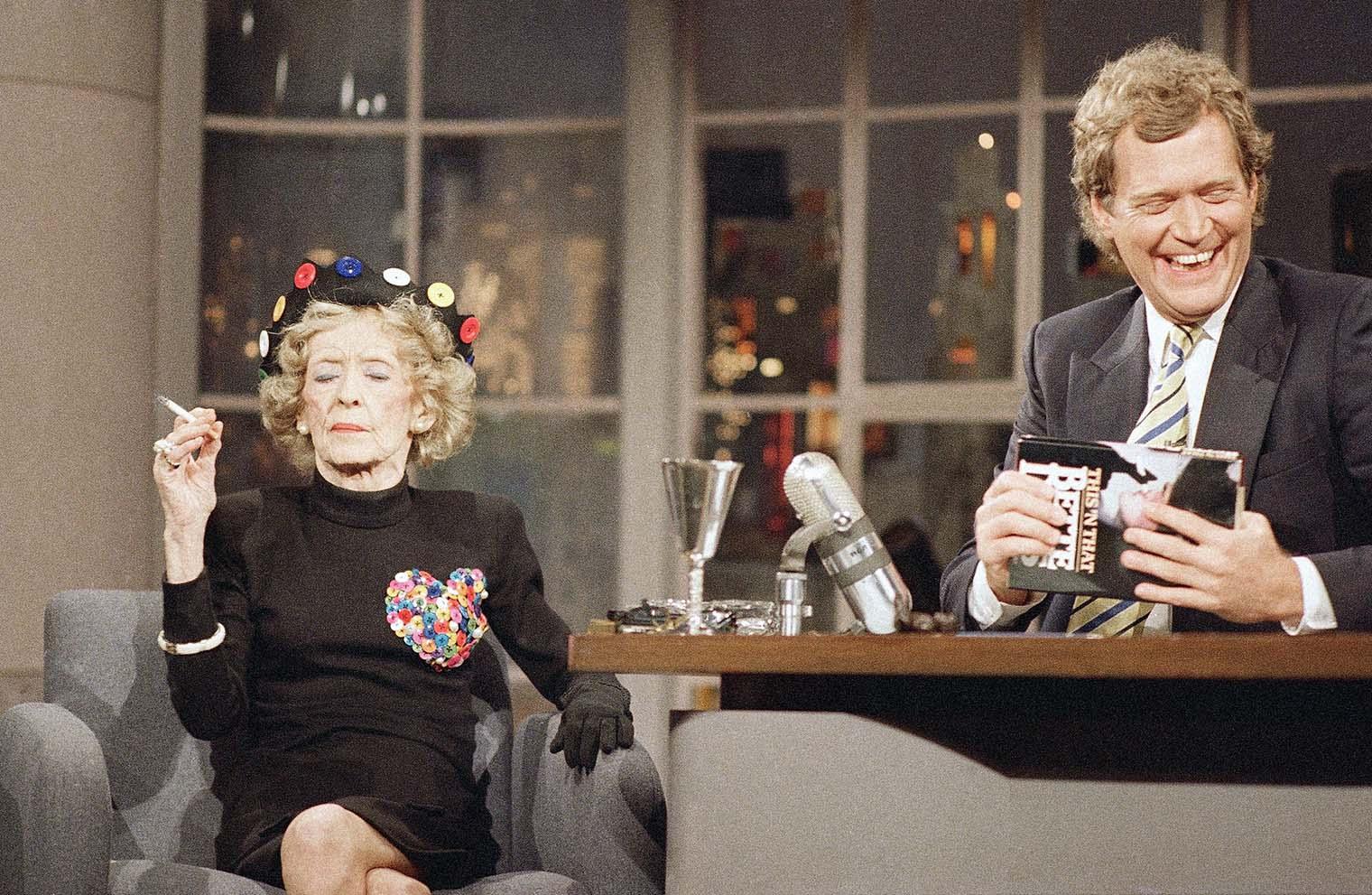 Bette Davis on Late Night with David Letterman at NBC Studios, May 26, 1987, after gifting Letterman with one of Patrick Kelly’s baby-doll pins. AP Photo / Ron Frehm