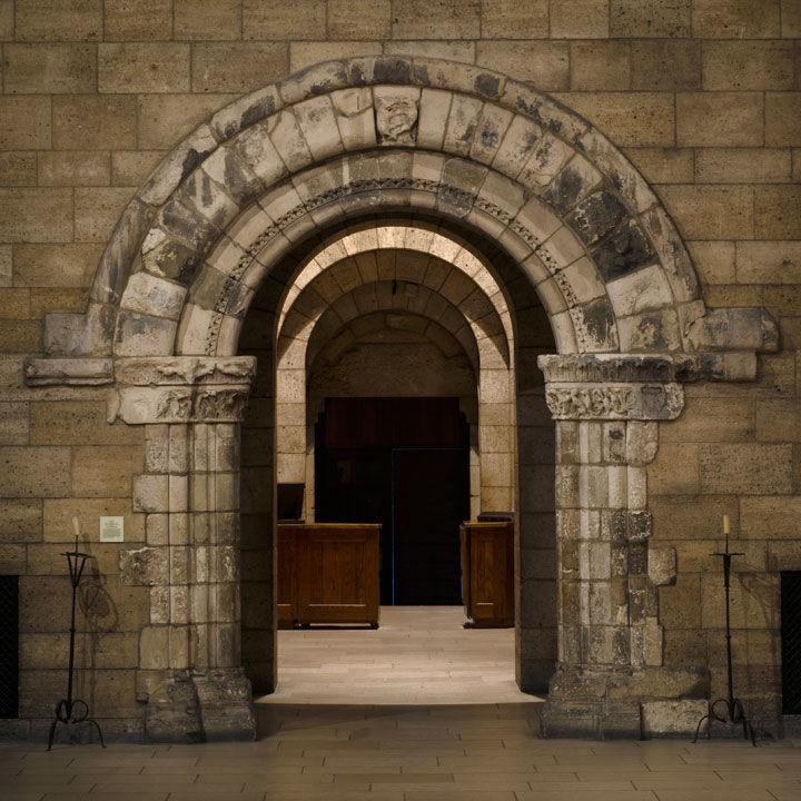 The stage directions strongly suggest that the play be performed in front of a church portal in the midst of a bustling town square. The Met Cloisters, a museum dedicated to the art and architecture of medieval Europe, provides a unique venue for such a historical presentation. For example, the portal that originally provided the backdrop for The Play of Adam would have looked very much like the doorway from the Benedictine abbey of Moutiers-Saint-Jean, providing a ready-made elevated stage a few steps above the audience members, who would have clustered at the foot of the steps to watch the play unfold.