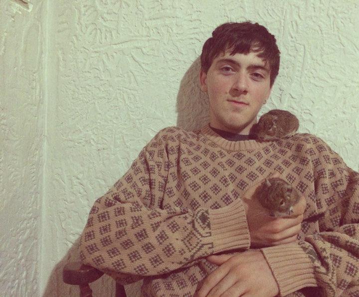 When making this portrait, it was raining, so I had to stay in. I built a set in my living room by moving furniture around and brought out a lamp. I asked my brother to pose for me, and he happened to be holding the degus.