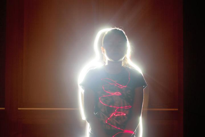 In Light, the red color gives the photograph a warm tone, but the figure is outlined with light, so the viewer cannot see the expression on the subject's face. Since the subject's expression is unknown, the viewer is able to be creative in determining what the subject might be feeling or thinking.