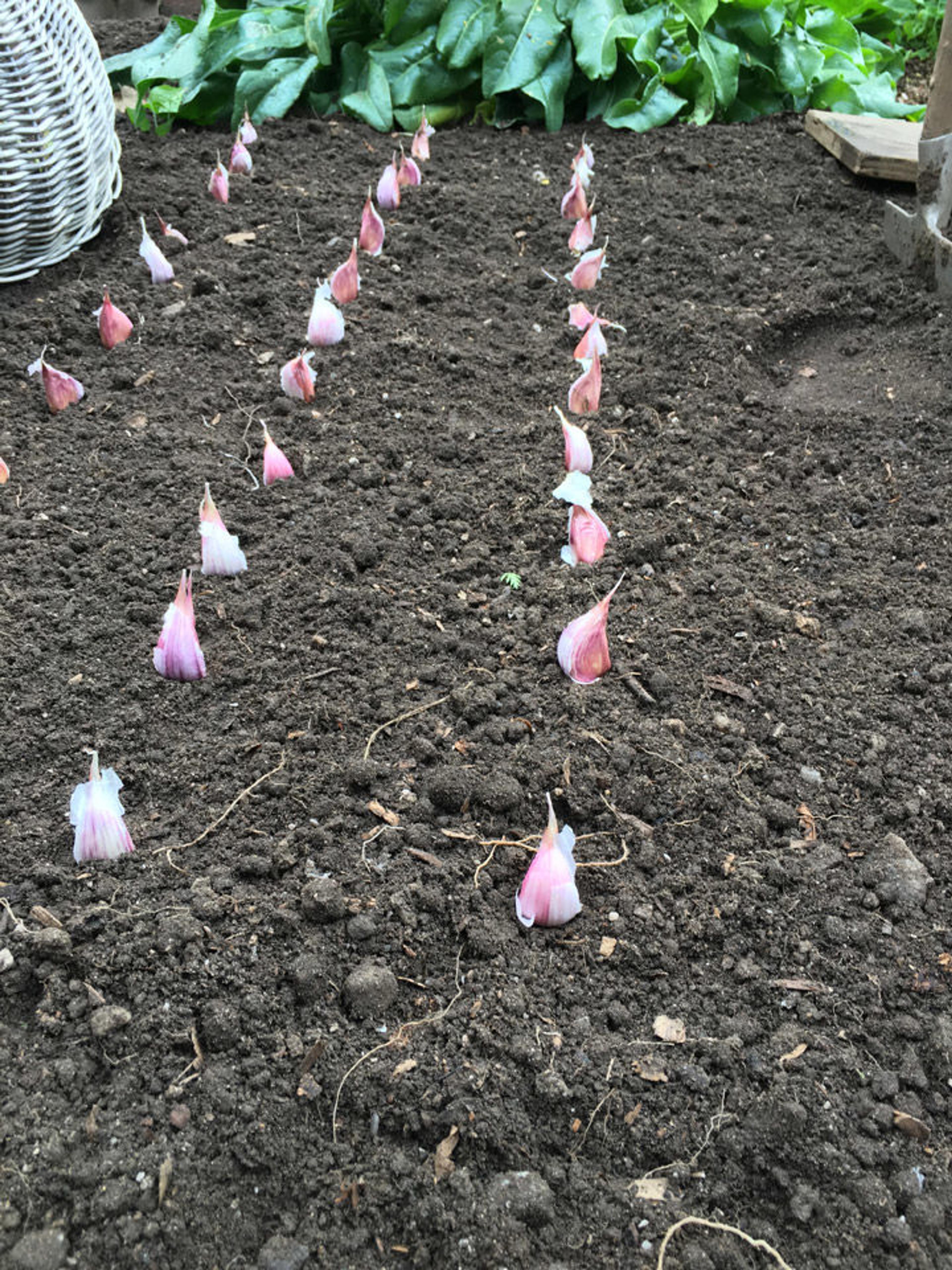 Cloves of Samarkand garlic (Allium sativum) in the Bonnefont Herb Garden. This garlic takes its name from the historic town of Samarkand in Uzbekistan, where it was collected in a marketplace. A UNESCO world heritage site, Samarkand was an important crossroads of the Silk Road. As a medicine and staple food, garlic has likely passed through this market hub for millennia.