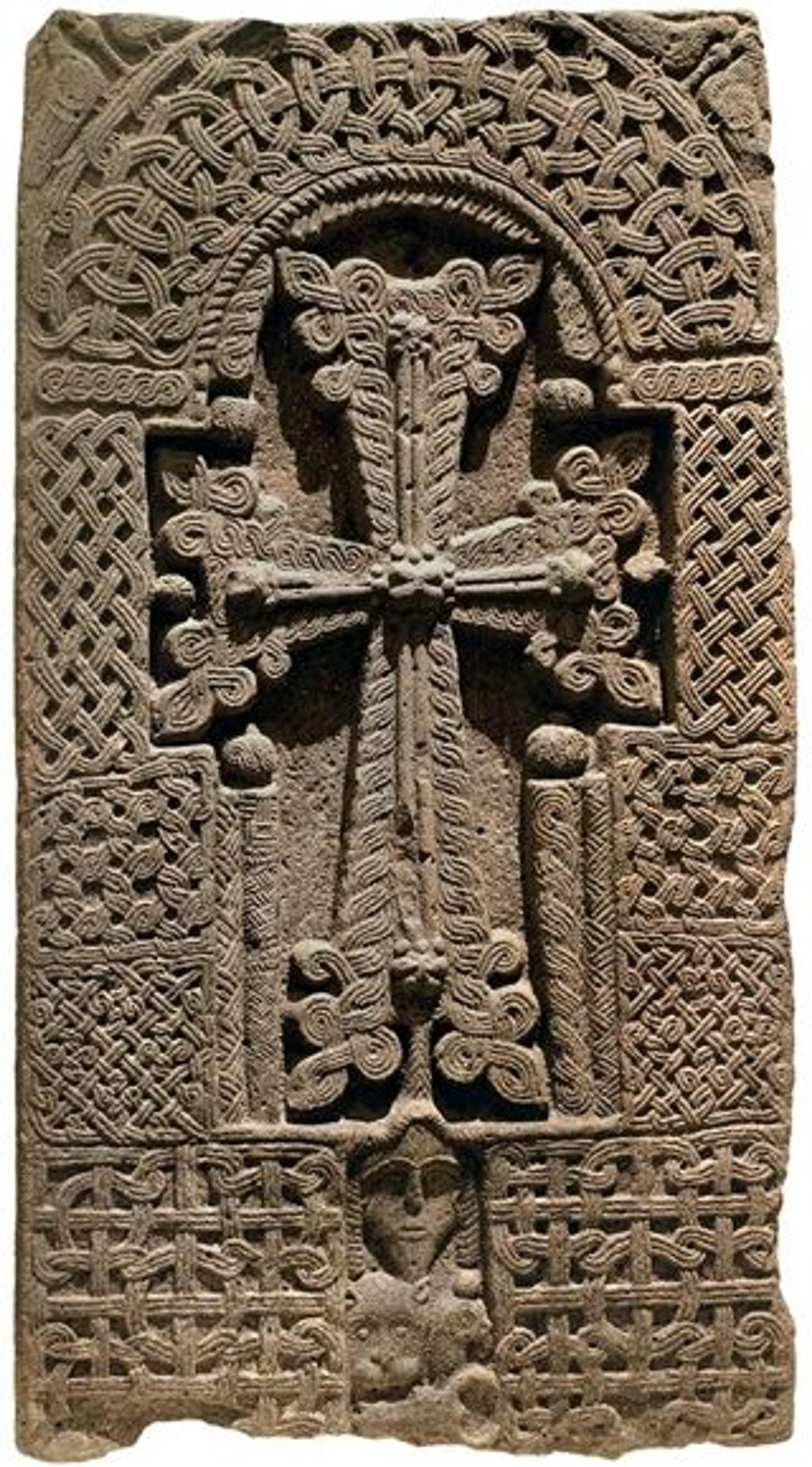 This khachkar, or carved Armenian stone cross, was the first to be displayed in a US museum and has been on view in The Met's medieval galleries since 2008. Khachkar, 12th–13th century. Lori Berd. Basalt, 72 x 38 3/4 x 9 in. (182.9 x 98.4 x 22.9 cm). History Museum of Armenia, Yerevan