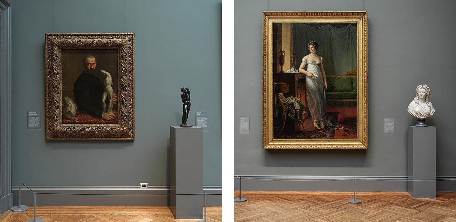 Left: View of Veronese's portrait of Alessandro Vittoria next to Vittoria's bronze sculpture. Right: View of Pajou’s marble bust of Madame Lavoisier. ;Jacques-Louis David’s painting of Madame Lavoisier is on an adjacent wall.
