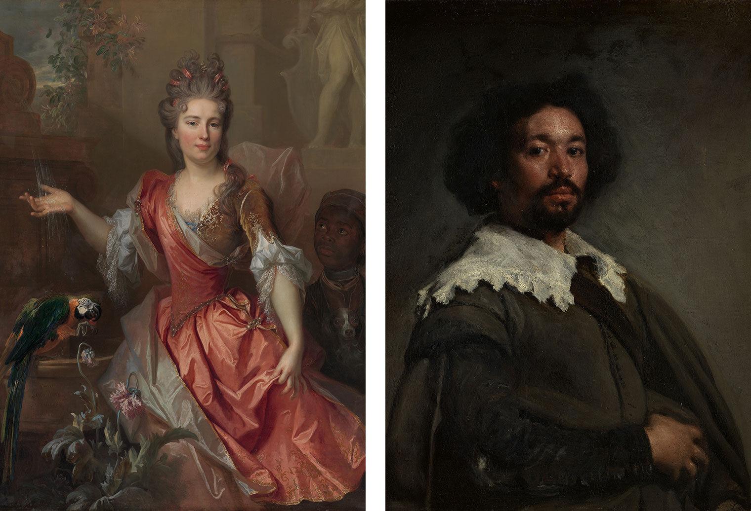 Left: Nicolas de Largillierre (or Largillière) (French, 1656–1746). Portrait of a Woman and an Enslaved Servant, 1696. Oil on canvas, 55 x 42 in. (139.7 x 106.7 cm). The Metropolitan Museum of Art, New York, Rogers Fund, 1903, (03.37.2). Right: Velázquez (Diego Rodríguez de Silva y Velázquez) (Spanish, 1599–1660). Juan de Pareja (1606–1670), 1650. Oil on canvas, 32 x 27 1/2 in. (81.3 x 69.9 cm). The Metropolitan Museum of Art, New York, Purchase, Fletcher and Rogers Funds, and Bequest of Miss Adelaide Milton de Groot (1876–1967), by exchange, supplemented by gifts from friends of the Museum, 1971 (1971.86)