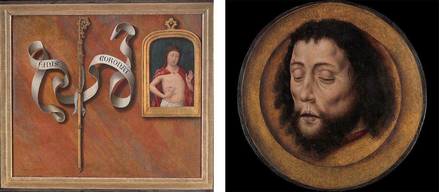 Left: Aelbert Bouts (Netherlandish, ca. 1451/54–1549). Head of Saint John the Baptist on a Charger, ca. 1500. Oil on poplar, Diameter 11 1/8 in. (28.3 cm). The Metropolitan Museum of Art, New York, Bequest of Rupert L. Joseph, 1959. Right: Bernard van Orley, (Netherlandish, ca. 1492–1541/42). The Birth and Naming of Saint John the Baptist; (reverse) Trompe-l'oeil with Painting of The Man of Sorrows, ca. 1514–15. Oil on wood, 25 x 30 in. (63.5 x 76.2 cm). The Metropolitan Museum of Art, New York, Bequest of Hertha Katz, 2000, (2001.216.3)