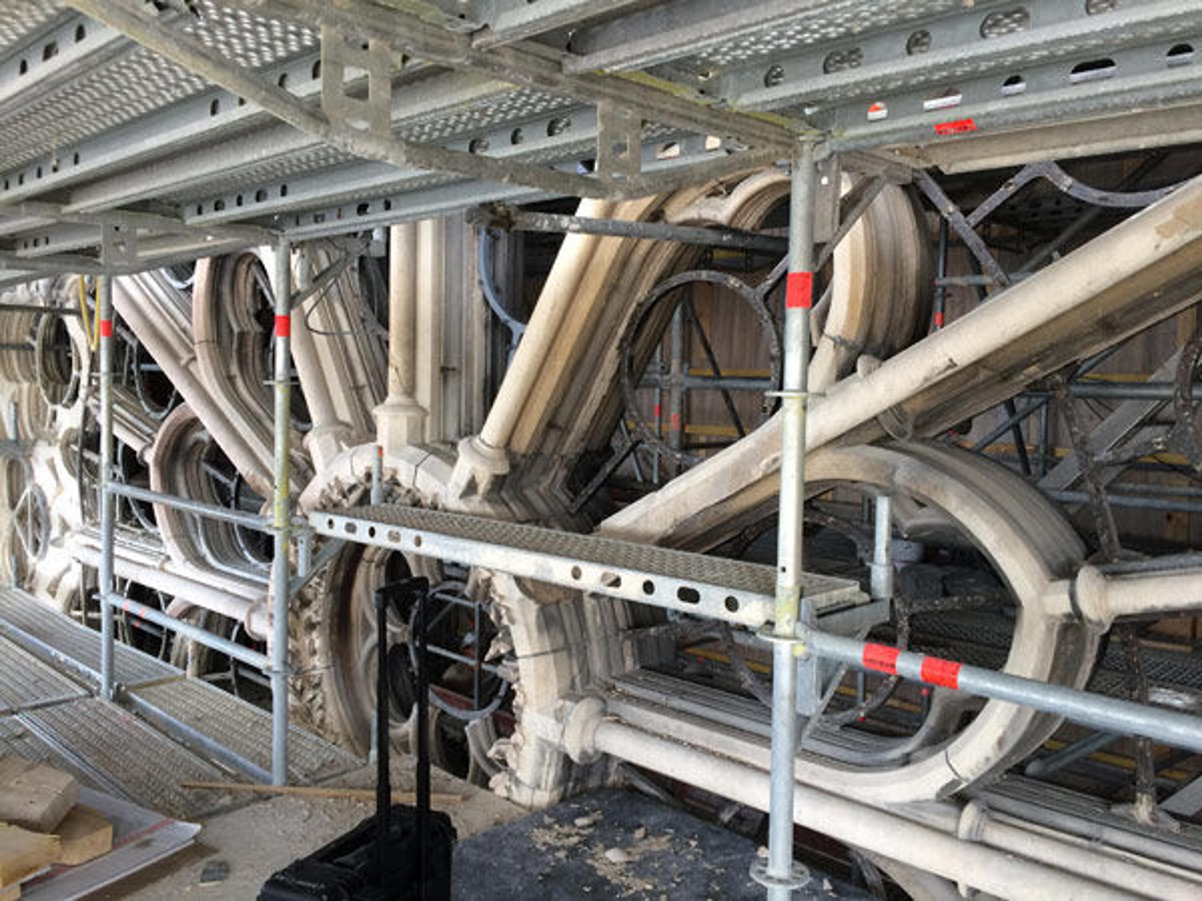 Each level of the scaffold is more than two meters high. When viewing from the ground, as we normally do when visiting a building, it is simply impossible to appreciate the enormity of the window, the thickness of the masonry, the elaborate network of metal armature, and the exquisite carving that is so many meters above us.