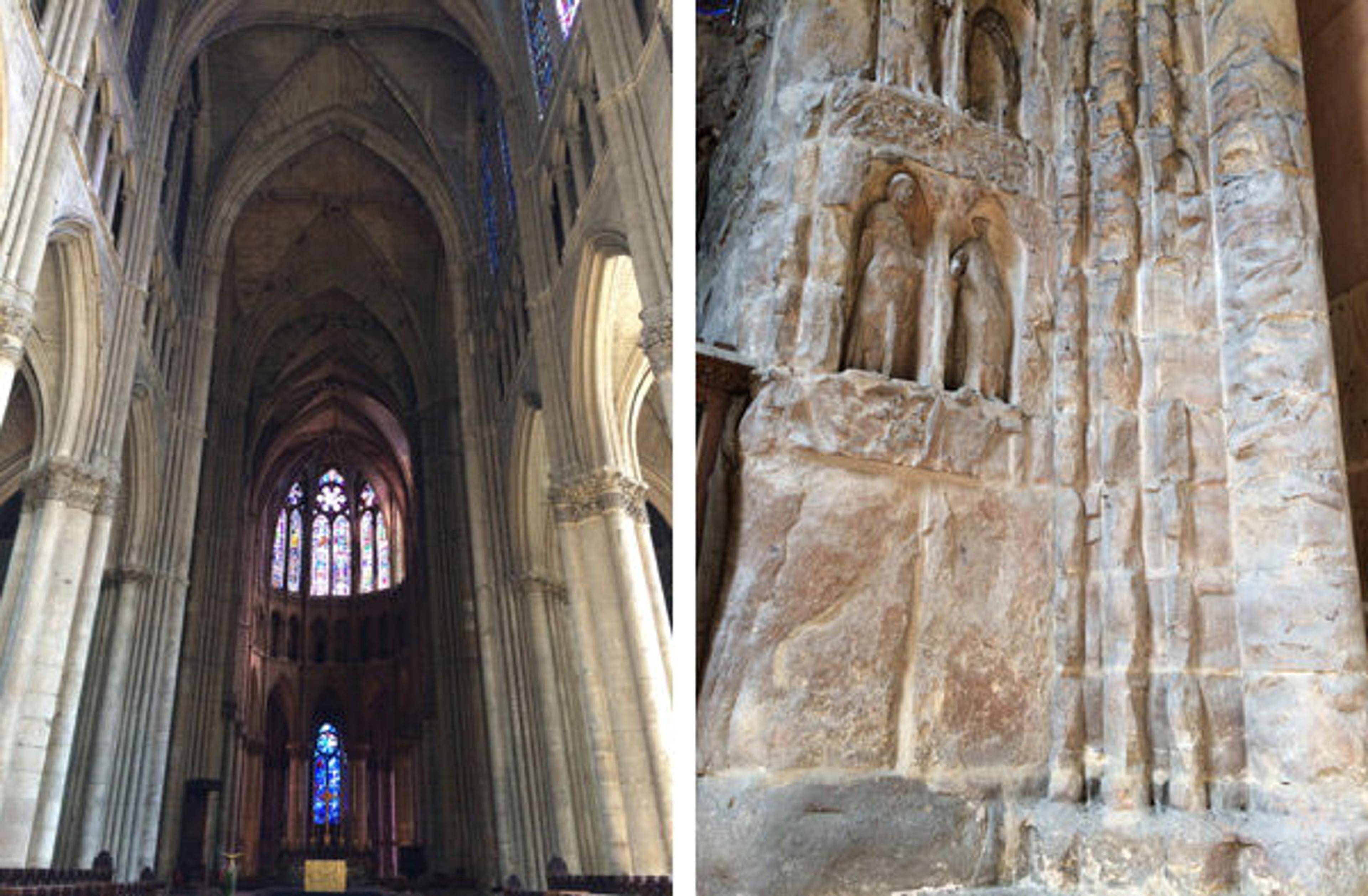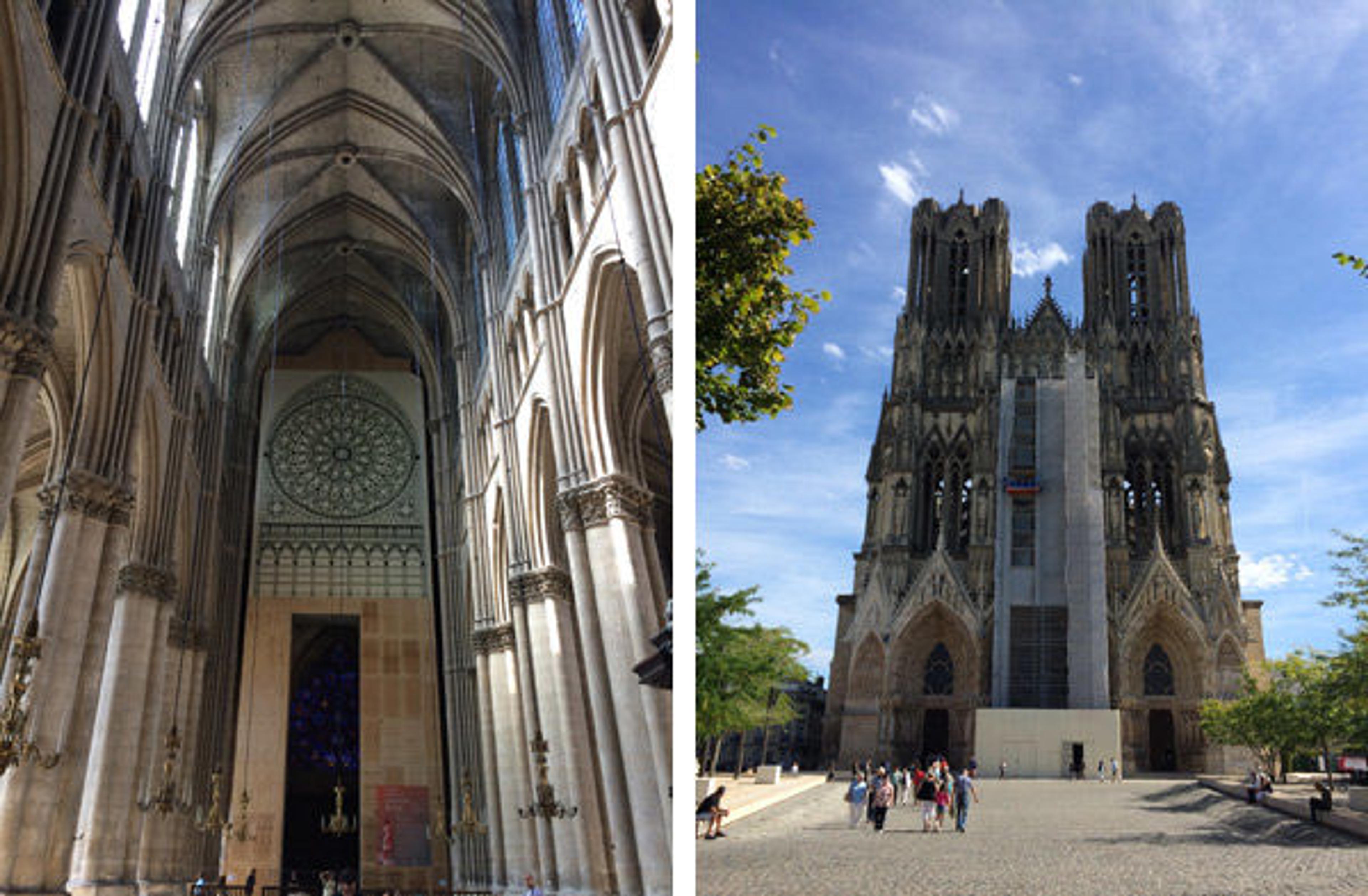 Left: Reims Cathedral, interior, looking toward the choir. Right: Reims Cathedral, interior of west facade, showing fire damage from World War I. All photographs courtesy of the author