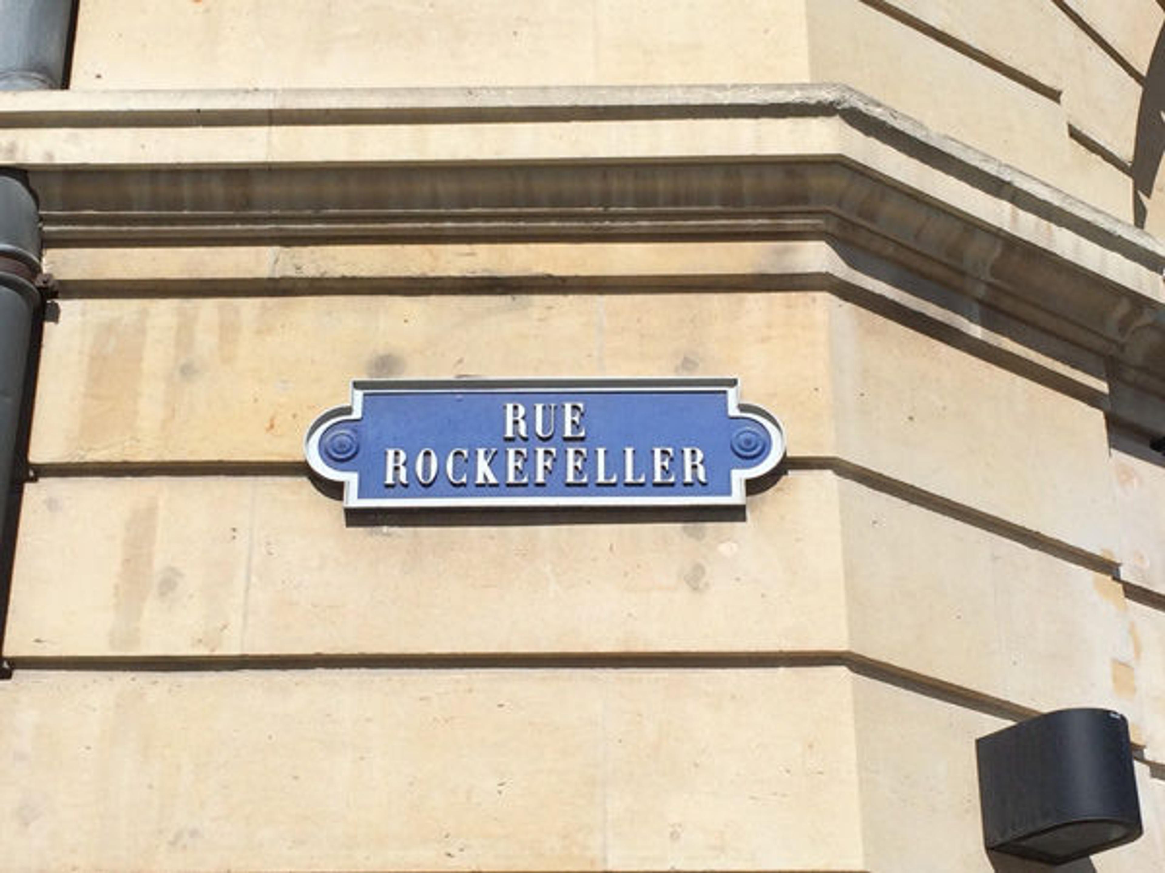 A sign for "Rockefeller Street" across the plaza from the cathedral