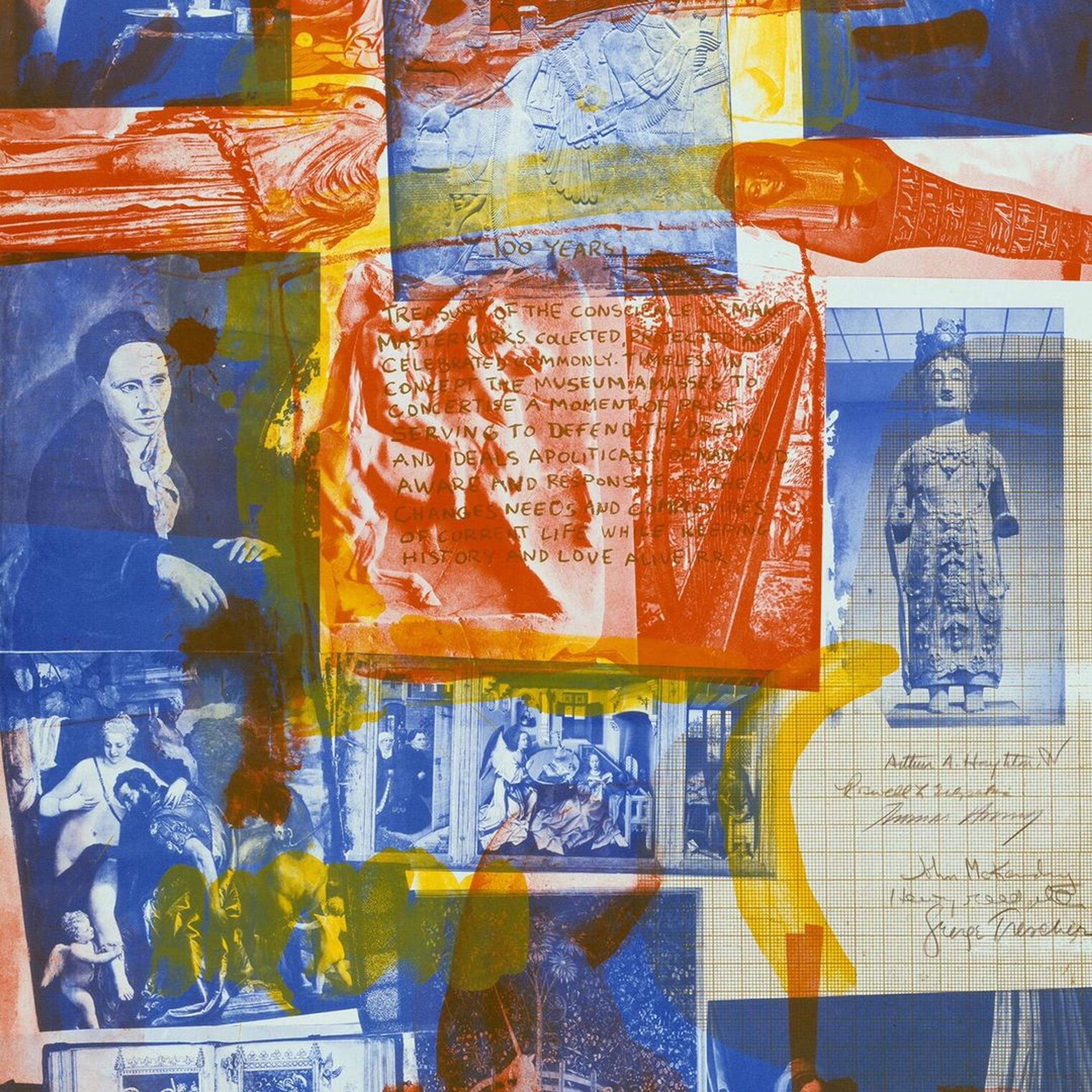 Given his interest in found imagery, as well as his deep ties to printmaking, Rauschenberg was a natural choice to create a commemorative piece to celebrate the Museum’s landmark anniversary. Integral to his art is the process of collage and the attendant perceptual and sensorial shifts that arise from the radical juxtapositions the practice allows. Early in his career, he revealed an interest in combining materials, objects, and visual elements from a variety of sources including personal photographs, text and pictures from newspapers, and reproductions of artworks. By the 1950s, the instinct to create works that demanded a dramatic rethinking of pictorial space was so great that he termed his artworks “combines” in reference to this heterogeneous approach. Rauschenberg’s all-over compositions created further disruptions. Rather than creating an illusionistic space, such compositions have been described as evoking “a flatbed picture plane” in which multiple images culled from both fine art and everyday life are extended across pictorial surfaces in a nonhierarchical order.