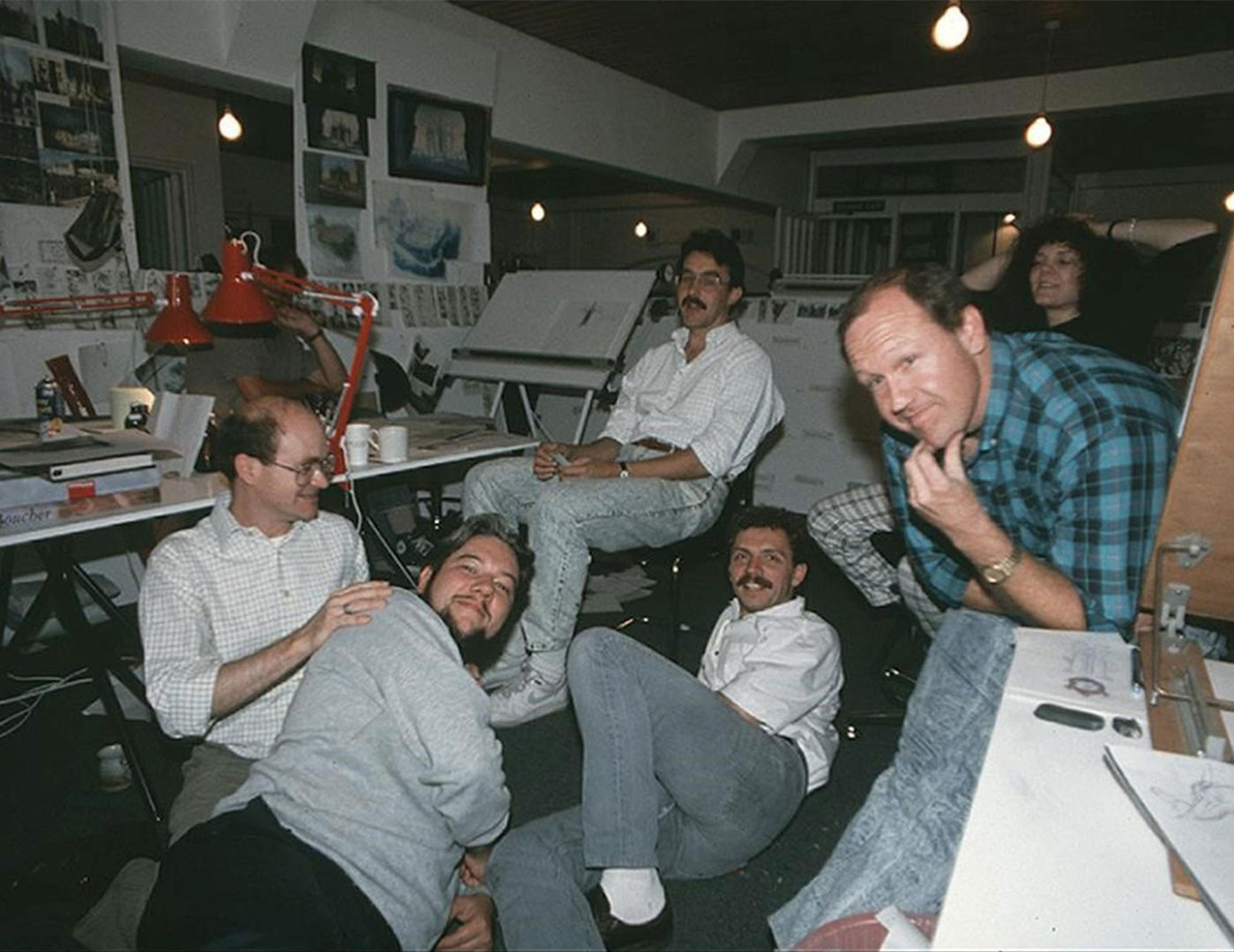 Richard Purdum, Tom Sito, Don Hahn, Andreas Deja, Glen Keane, and Jean Gillmore working on an early, abandoned concept for Beauty and the Beast. Photograph courtesy Hans Bacher