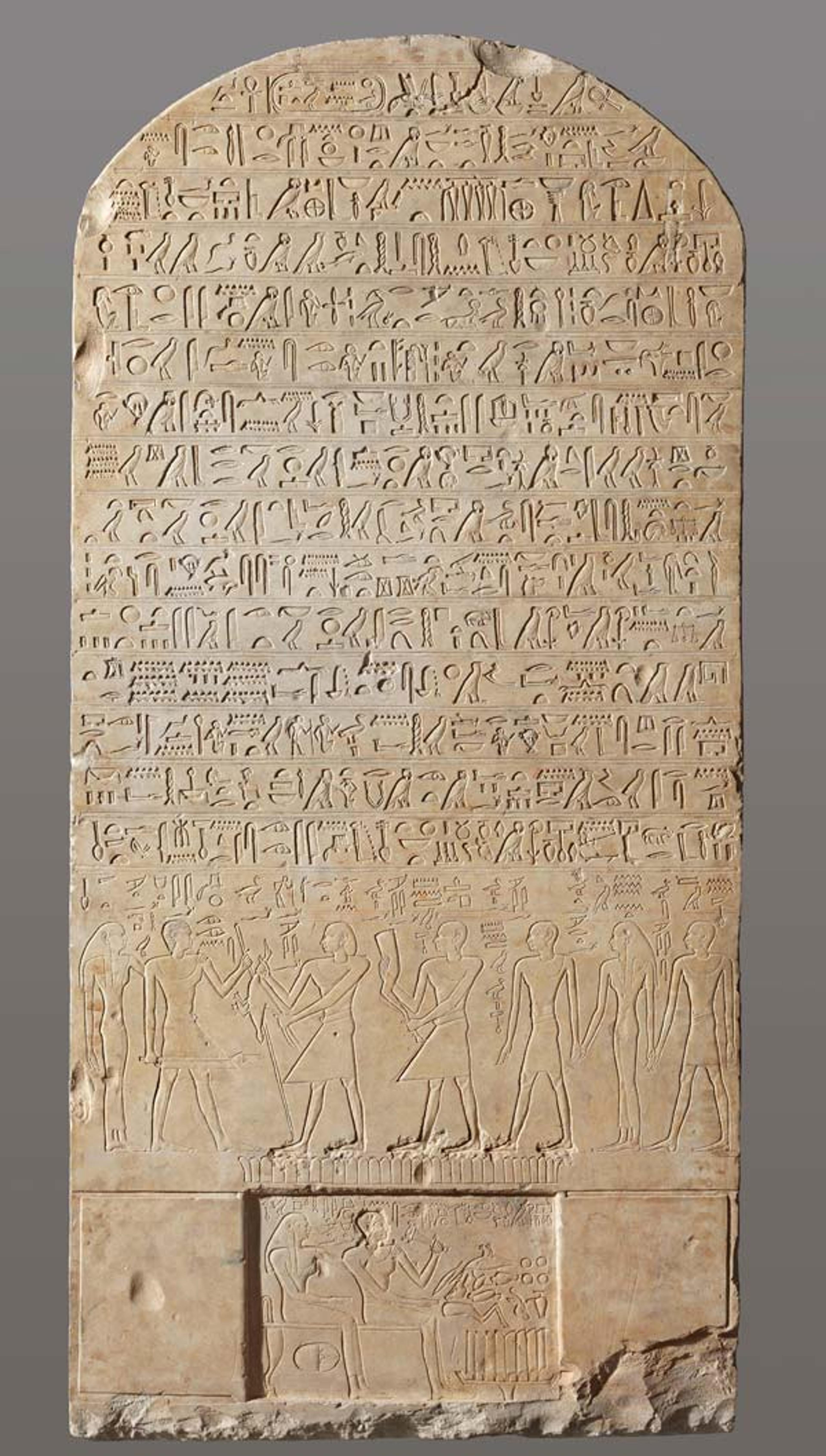 Providing viewers with a rare glimpse into the notion of art in ancient Egypt, Irtisen speaks in his text of knowing the rules of proportions, and how to render the "going of a male statue and the coming of a female statue . . . the convulsion of the single prisoner, the expression of fear on the face of enemies . . . the leg movements of one running." With this knowledge, he might have outlined the shapes of the hieroglyphs, remnants of which the stela still bears. Keeping the general shape of the hieroglyph while substituting the form of the palette, he renders the shape easily recognizable in a specific manner that shows his masterful knowledge of shapes and forms, both past and present.
