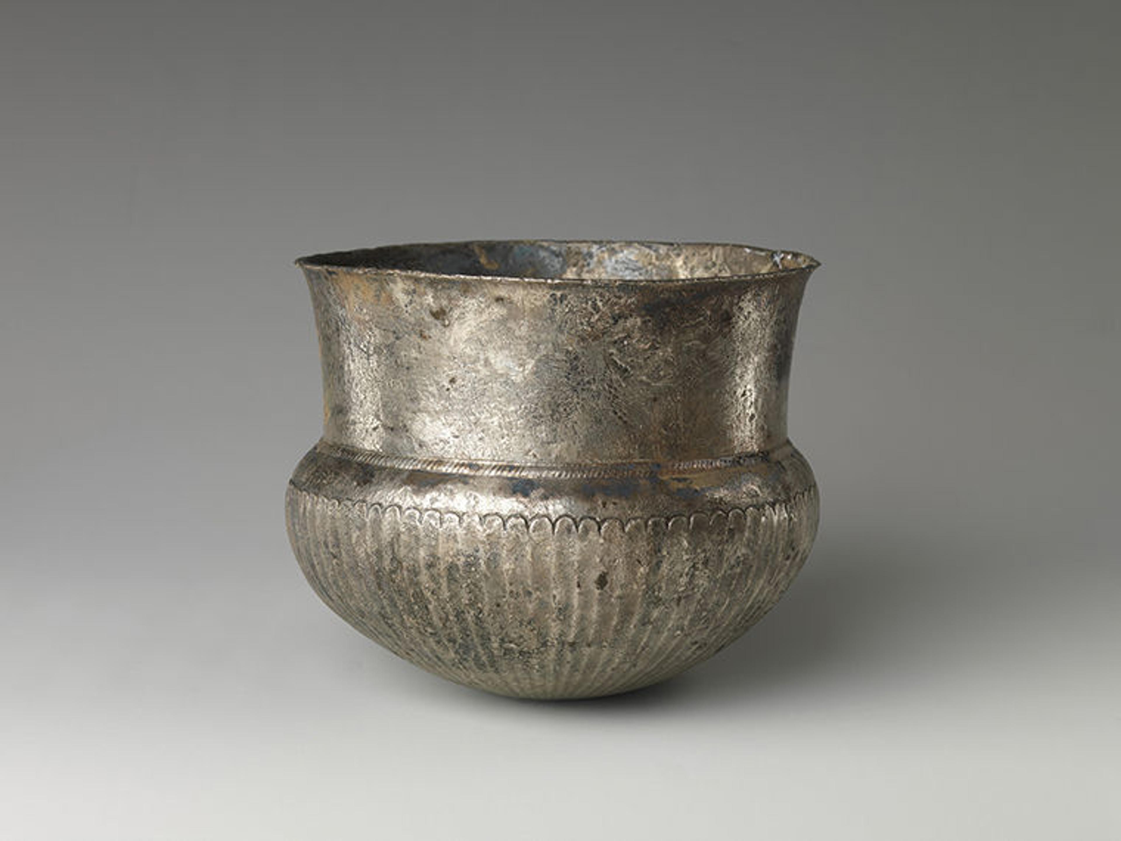 Bowl with flutes from shoulder to rosette at base and with inscribed weight. Late Period–Ptolemaic Period (4th century B.C.). From Egypt, Lower Egypt. Silver, H. 4 1/8 x Diam. 4 3/4 in. at mouth, 5 1/8 in. at body (10.5 x 12 and 13 cm). The Metropolitan Museum of Art, New York, Rogers Fund, 1918 (18.2.14)