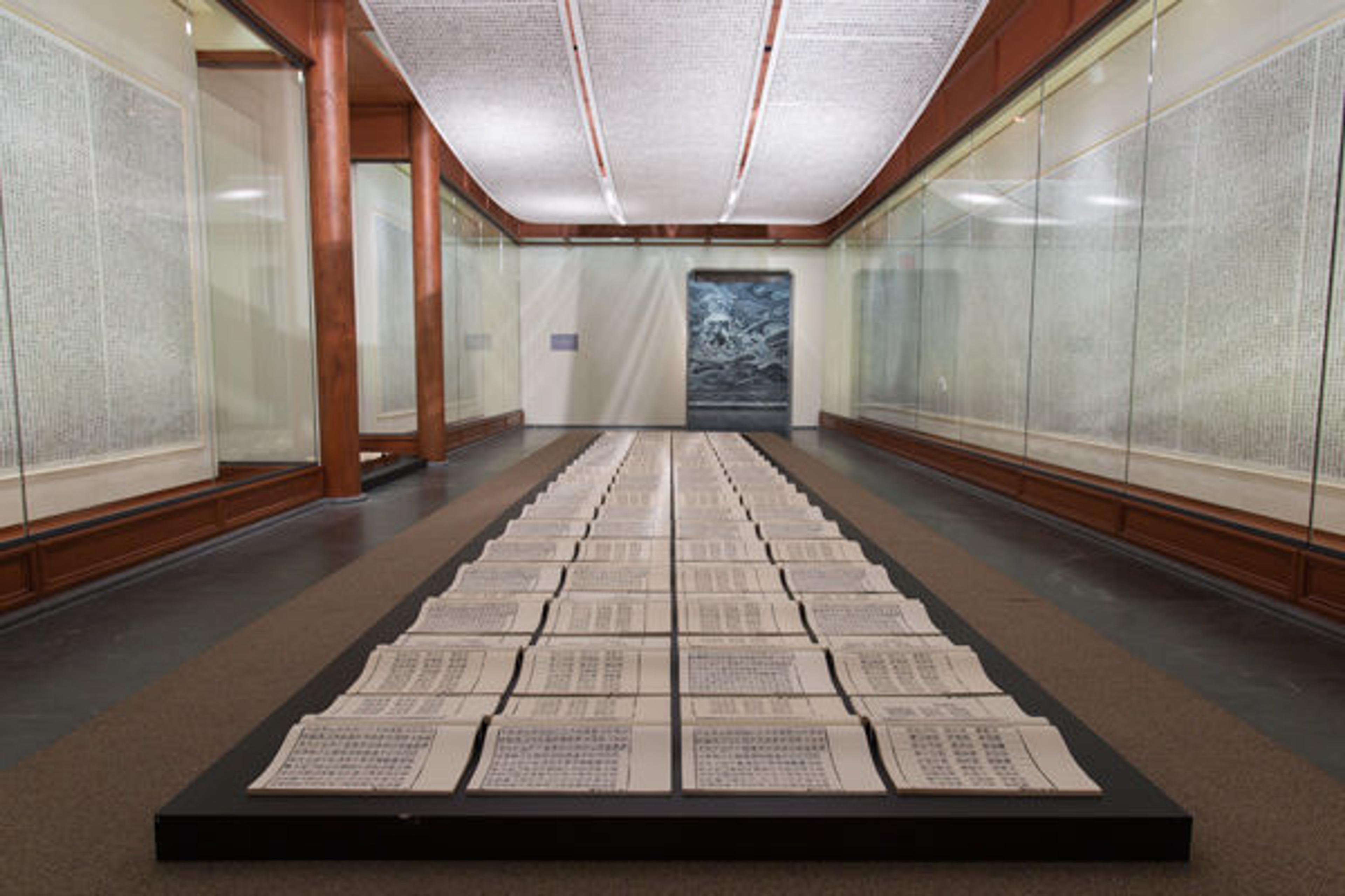 Xu Bing (b. 1955). Book from the Sky, ca. 1987–1991. China. Installation of hand-printed books and ceiling and wall scrolls printed from wood letterpress type; ink on paper. Lent by the artist. © Xu Bing