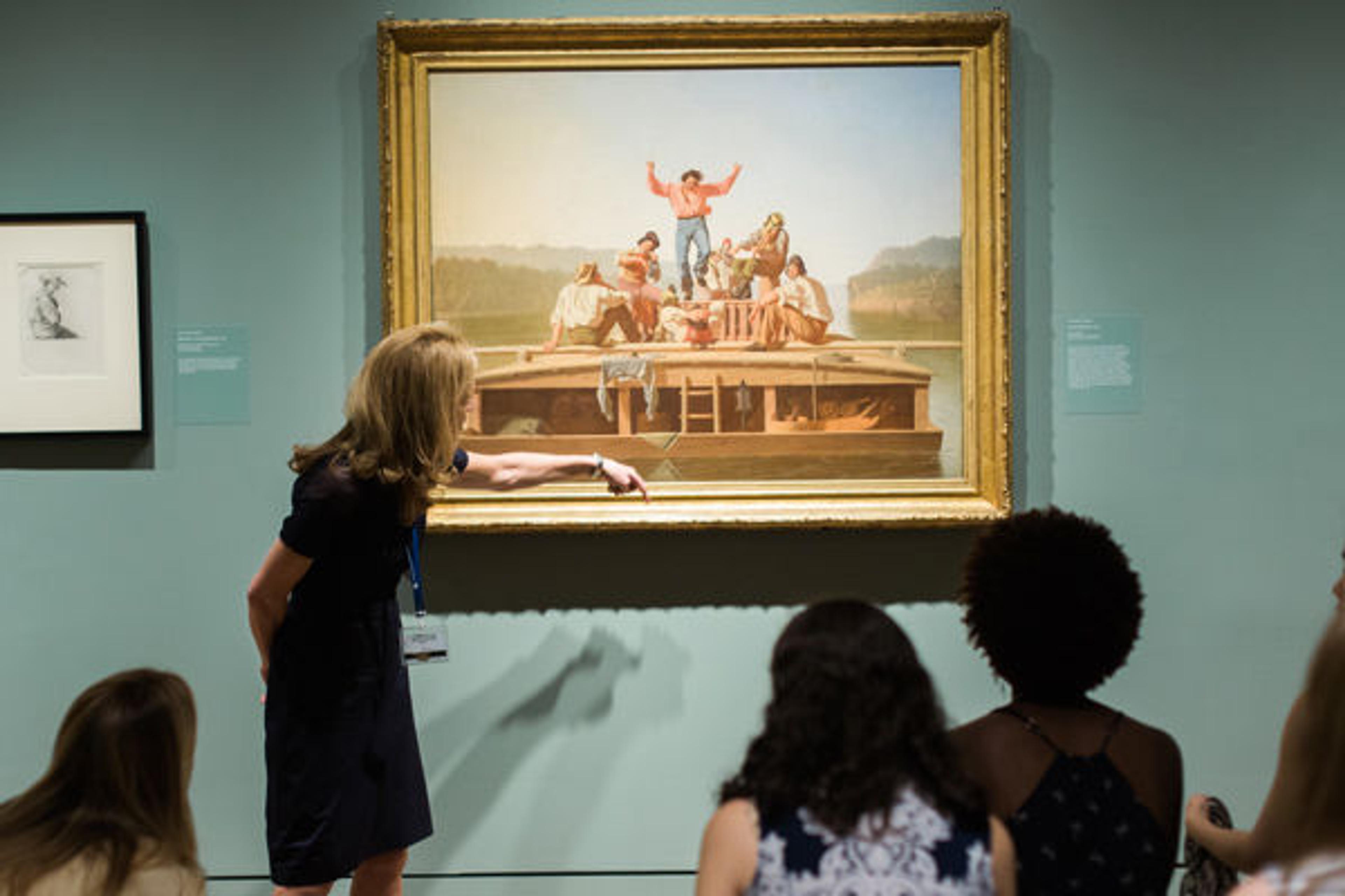 Educator Page Knox asks her Observant Eye group to identify examples of activity and stillness in George Caleb Bingham's The Jolly Flatboatmen