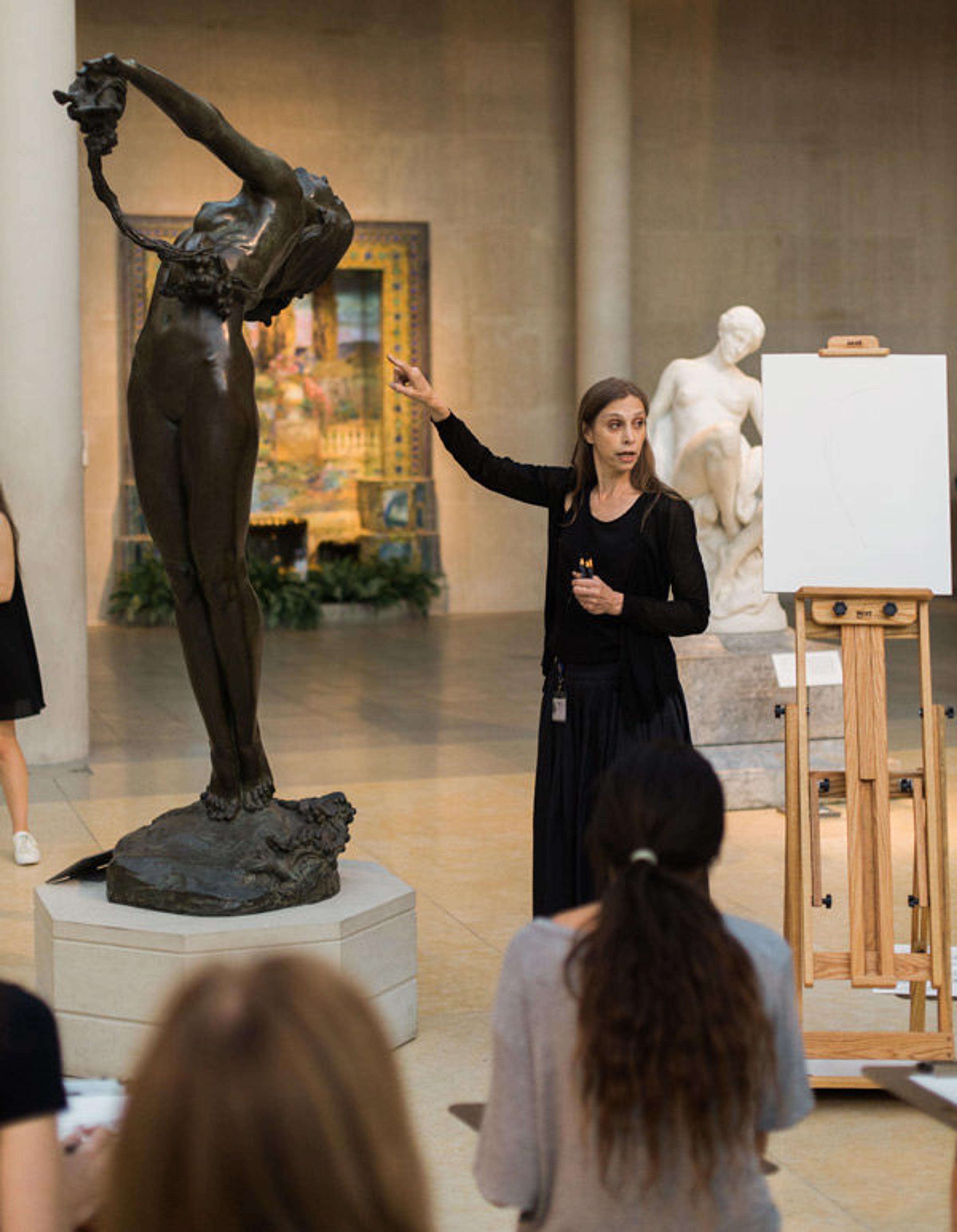 After being greeted by CGM members in the Great Hall, students proceeded to The Charles Engelhard Court, where teaching artists Deborah Lutz and Beverly Acha led Drop-in Drawing sessions that featured sculptures in the permanent collection. Each student received a large clipboard with fresh paper, a kneaded eraser, and charcoal, ebony, and graphite pencils. Deborah and Beverly guided each group through the process of laying the foundation for a drawing.