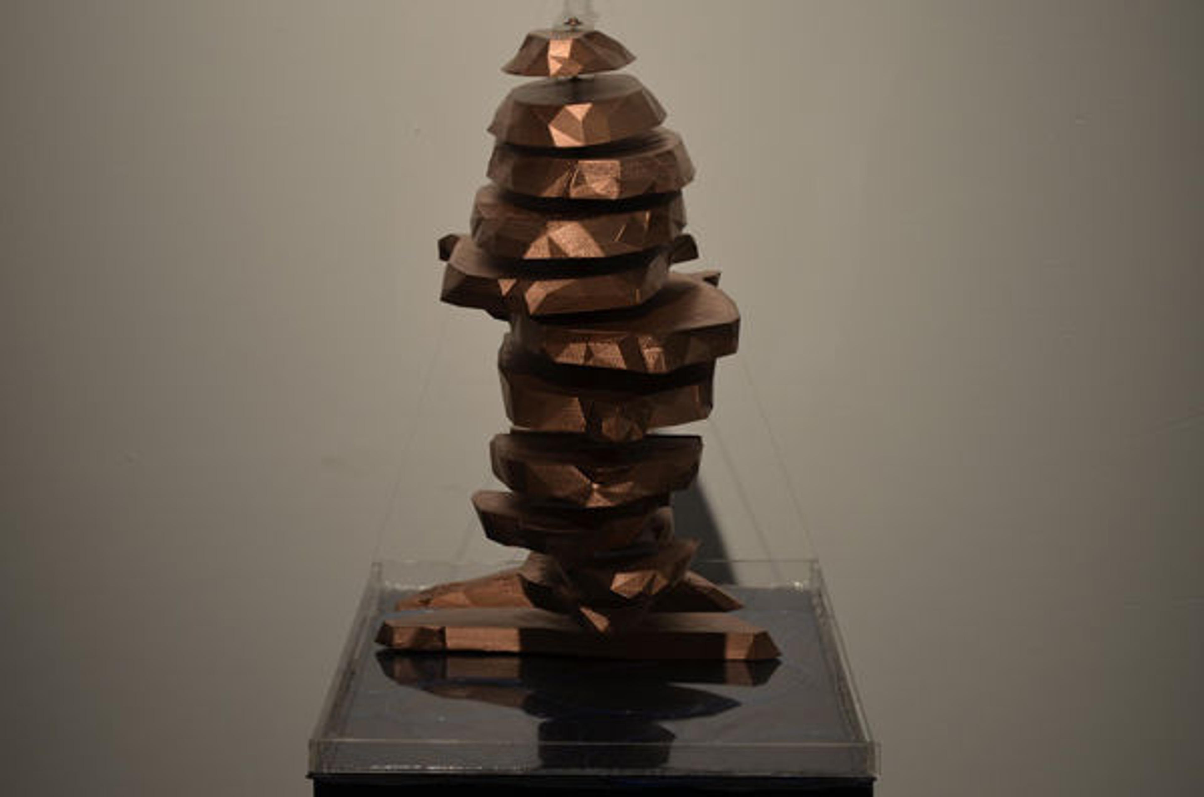 Given the amount of layers mounted on the plexiglass spine, erecting the sculpture in a vertical, stable position was a daunting task. To stabilize the top, I used three fishing lines connected to the base of the pedestal and positioned the top of the spine. After a few breakages, the sculpture was finally complete.