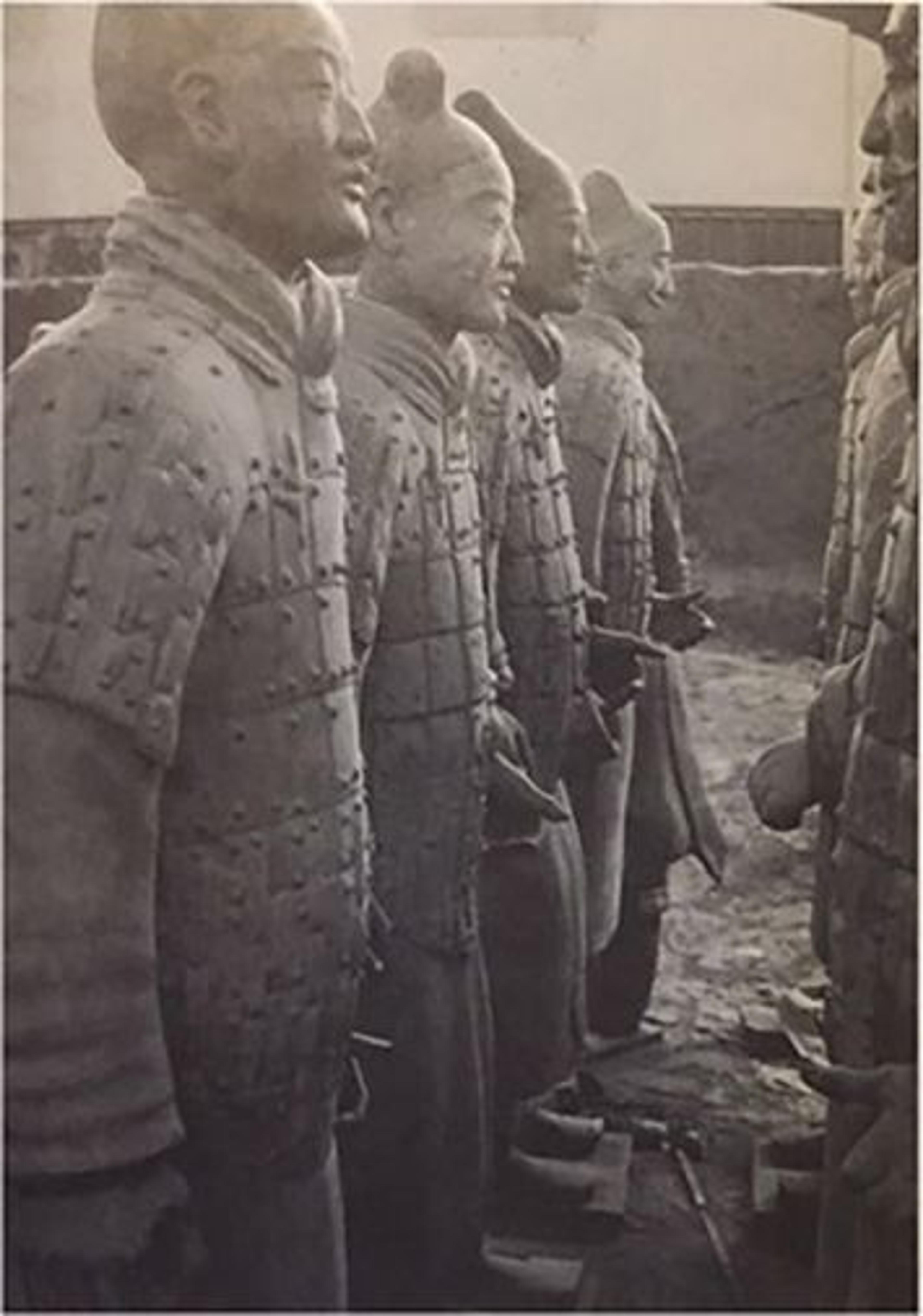Left: Reconstructed warrior figures, from《秦俑全真复制研究及理论思考》("A theory about the construction of the Qin terracotta figures based on research and reconstruction"), Xiong Shi Mei Shu, 1994. Photo by Sun Wei