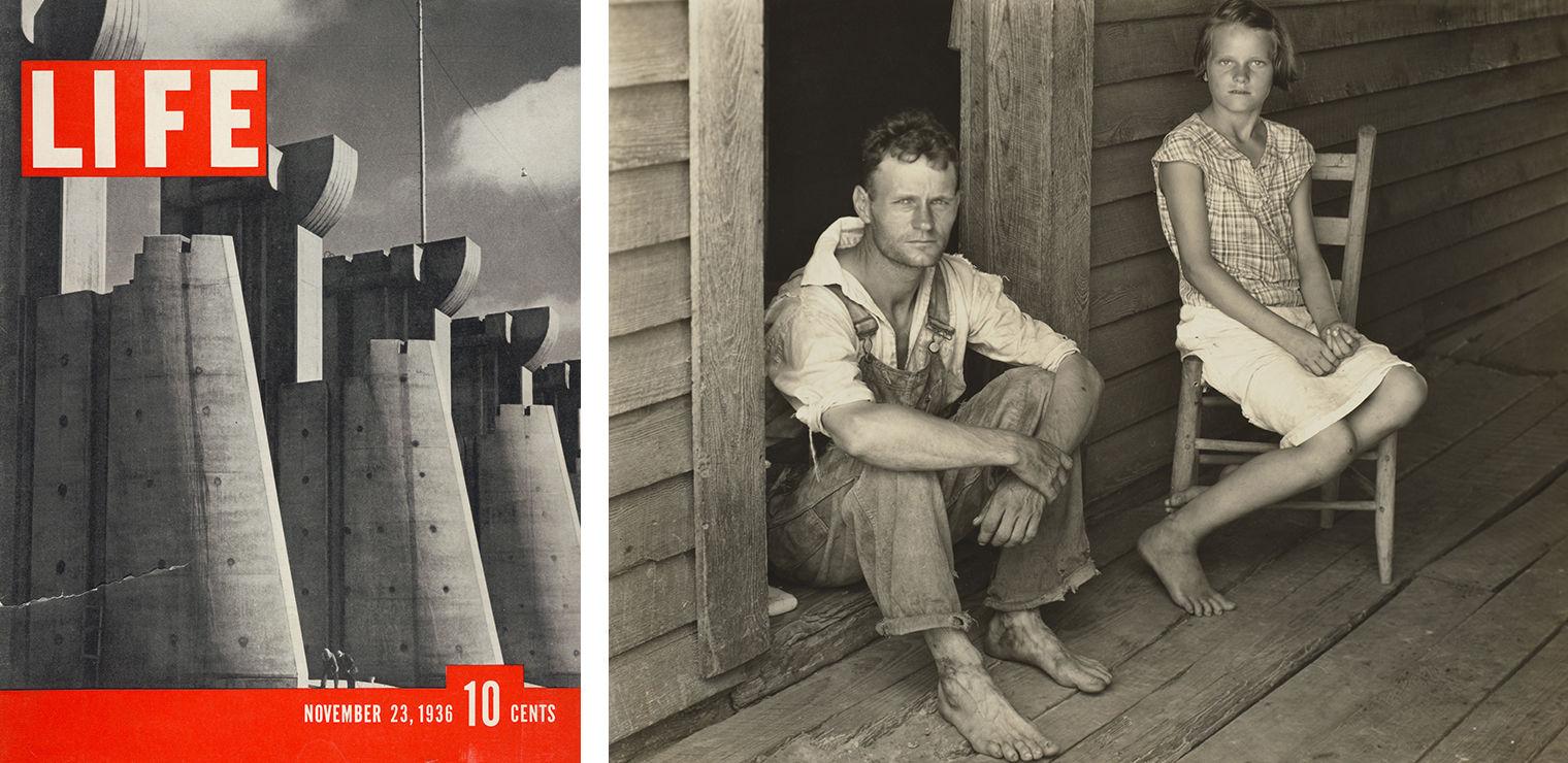 Left: 1936 cover of Life magazine with a photo by Margaret Bourke-White. Right: Walker Evans (American, 1903–1975). Floyd and Lucille Burroughs on Porch, Hale County, Alabama, 1936. Gelatin silver print, 77/16 × 95/16 in. (18.9 × 23.7 cm). The Metropolitan Museum of Art, New York, Purchase, Marlene Nathan Meyerson Family Foundation Gift, in memory of David Nathan Meyerson; and Pat and John Rosenwald and Lila Acheson Wallace Gifts, 1999 (1999.237.4)