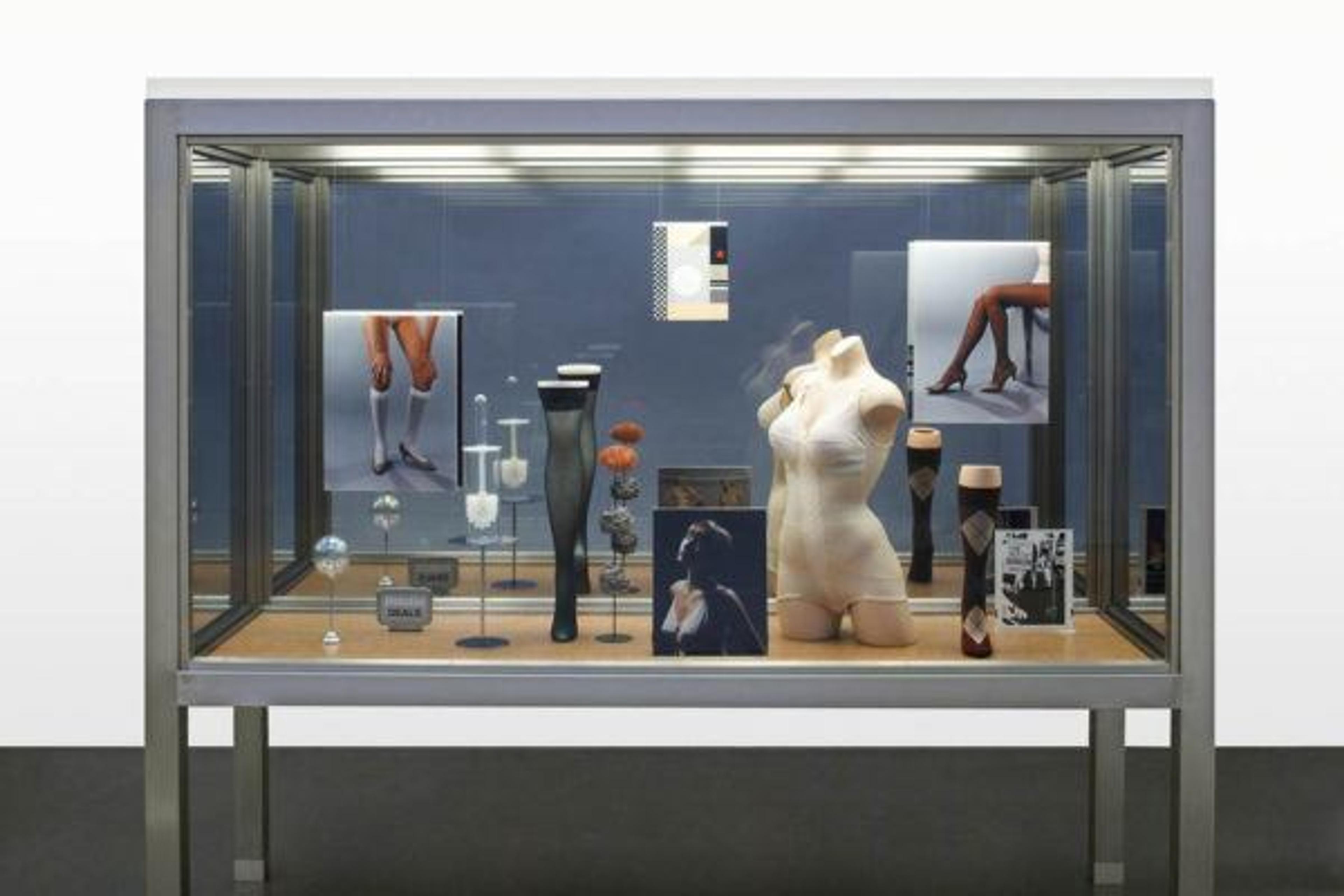 Body form (torso with undergarment), two plastic frames with two photos in each, leg form (calf high with sock), leg form (thigh high with stocking), round metal stand, toilet scrubber in holder, metal sculpture, 2 glass balls, double sided ENDLESS DEALS sign, clipstand, double sided color prints mounted on Sintra, double-sided C-print/silver gelatin print mounted on Sintra and unmounted silver gelatin print; 82 × 96 × 27 in. (208.3 × 243.8 × 68.6 cm). The Metropolitan Museum of Art, Purchase, Stephen and Nan Swid Gift and The Cynthia Hazen Polsky Fund, 2014 (2014.297a–w) © Josephine Meckseper