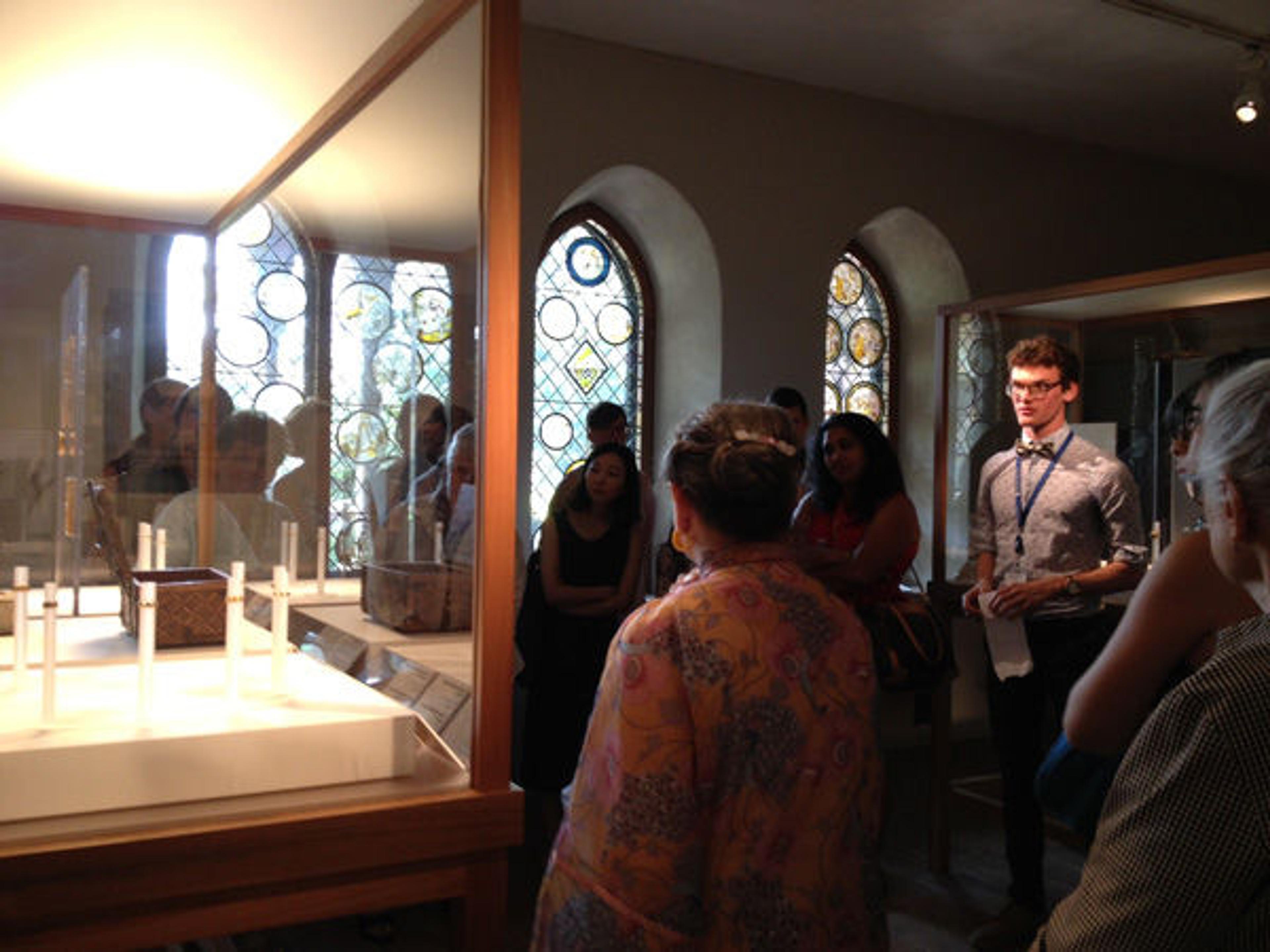 Noah Stevens-Stein reveals the meaning behind a coffret (minnekästchen) in the exhibition Treasures and Talismans: Rings from the Griffin Collection. Photograph by Leslie Bussis Tait