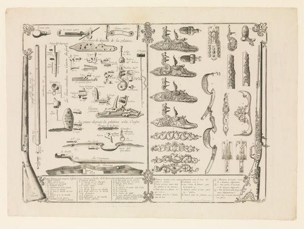 A mid-eighteenth-century print, sold by a print vendor named Perrier (fig. 4), shows the parts of two flintlock guns in great detail. The stocks of a standard musket and a more elaborate hunting gun are shown in their entirety on either side of the print and form part of the decorative framework. Inside the frame, as if dissected, the individual parts of the disassembled weapons down to the screws and straps are systematically represented, with labels and numbered inscriptions further identifying each part in detail. The print conveys practical information to potential users and collectors of the weapons, or craftsman who could simultaneously see how to assemble and decorate a flintlock gun.
