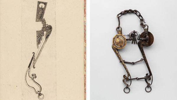 Left: fig. 6. Rudolf Franz Ferdinand von Talmberg (Bohemian, ca. 1645–1702). Album of Bit Designs, 1674. Bohemian. Ink on paper; covers: 14 1/2 x 9 3/4 in. (36.8 x 24.8 cm); sheets: 14 1/4 x 9 1/2 in. (36.2 x 24.1 cm); plates: approximately 12 1/4 x 4 in. (31.5 x 10 cm). The Metropolitan Museum of Art, New York, Vivian Lam Gifts; and Bequest of Stephen V. Grancsay, Rogers Fund, Helmut Nickel Gift, and funds from various donors, by exchange, 2013 (2013.590). Right: fig. 7. Bit, ca. 1575–1625. Possibly Italian. Iron, gold, silver, copper alloy; 12 x 8 1/2 in. (30.5 x 21.6 cm). The Metropolitan Museum of Art, New York, Purchase, Kenneth and Vivian Lam Gift, 2006 (2006.44)