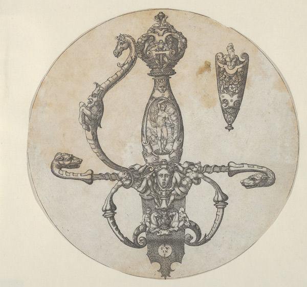 Fig. 3. Pierre Woeiriot (French, ca. 1531–1589). Design for a Sword Hilt, 1550–1560. Engraving; Sheet: 7 5/8 x 7 11/16 in. (19.3 x 19.6 cm) [diameter]. The Metropolitan Museum of Art, New York, The Elisha Whittelsey Collection, The Elisha Whittelsey Fund, 1949 (49.20.12)