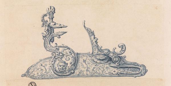 Fig. 9. Drawing from an Ornament Scrapbook: A Flintlock Gun Lock, 18th century. Probably French. Pen, blue ink, and blue wash; 7 9/16 x 3 5/8 in. (19.2 x 9.2 cm). The Metropolitan Museum of Art, New York, Purchase, Arthur Ochs Sulzberger Gift, 2011 (2011.308)