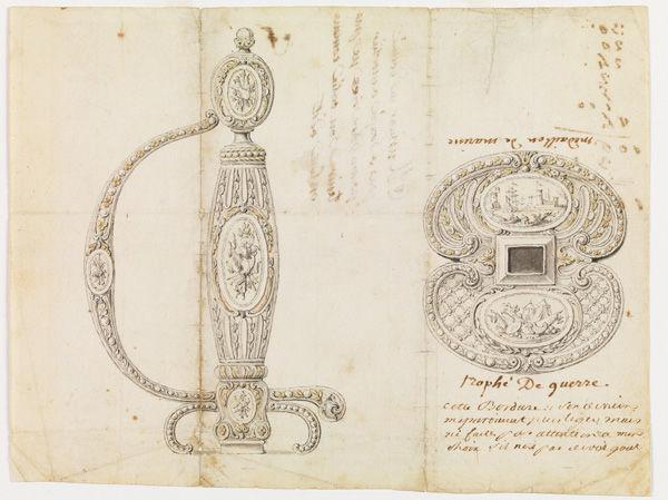 A rare and beautiful eighteenth-century French design for a sword hilt (fig. 8) gives us a sense of the way in which discussions about design and style took place. The drawing contains two designs for the hilt of the sword and the shell guard. The latter is portrayed from above to reveal its lavish decoration, for which two different options are shown—the upper half contains an oval medallion with a maritime scene, while the lower half has a similar medallion with a weapon trophy surrounded by trelliswork. An inscription below the design, directed at the client, explains that these are merely suggestions that can be altered without a problem to the client's taste. The drawings thus represents the opening of a discussion about the final design of this hilt.