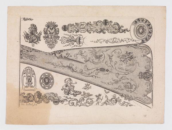 Fig. 5. De Lacollombe (French, active ca. 1702–ca. 1736). Print from Nouveaux Desseins D'Arquebuseries, ca. 1705–30. French, Paris. Ink on paper; 11 x 8 1/4 in. (27.9 x 20.9 cm). The Metropolitan Museum of Art, New York, Purchase, Bequest of Stephen V. Grancsay, Rogers Fund, Helmut Nickel Gift, and funds from various donors, by exchange, 2013 (2013.907)