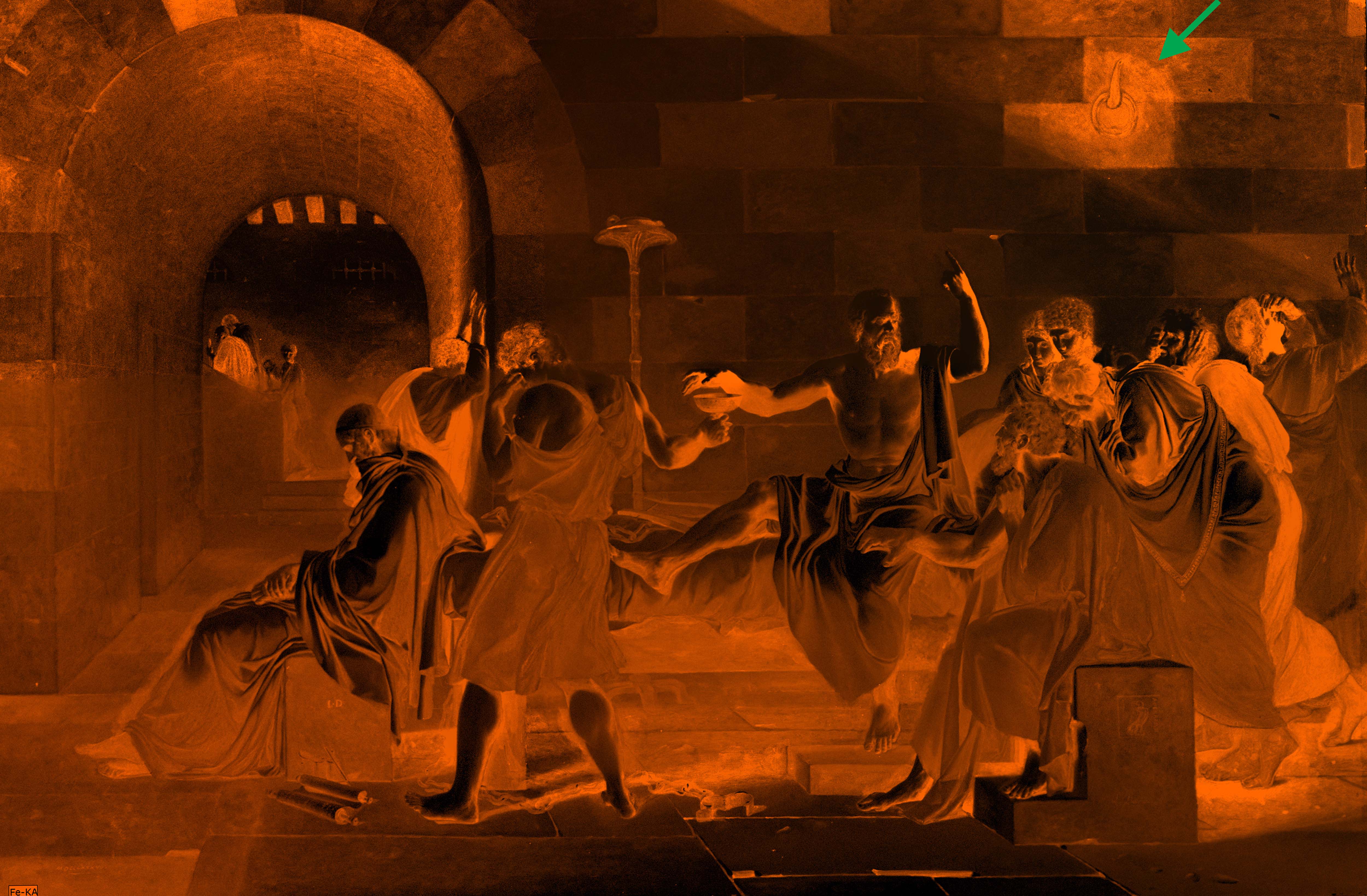 He initially blocked in the window on the wall behind Socrates but subsequently painted over it in favor of a more severe backdrop for the drama. In its place David painted a much smaller feature: a ring and hook.