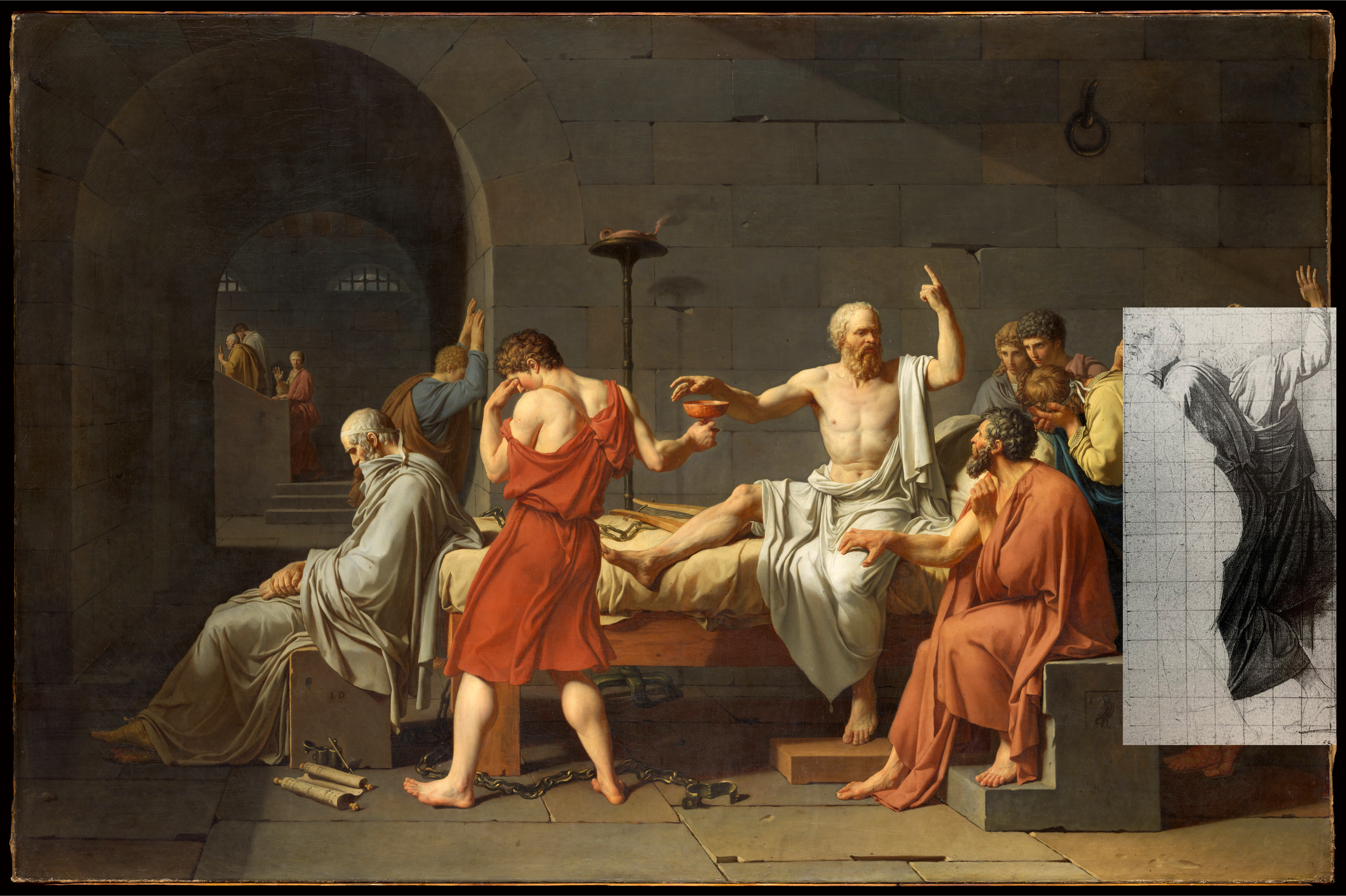 Jacques Louis David (French, 1748–1825). The Death of Socrates, ca. 1786. Pen and black ink, over black chalk, touches of brown ink, squared in black chalk, 11 in. x 16 3/8 in. (27.9 x 41.6 cm). The Metropolitan Museum of Art, New York, Purchase, Walter and Leonore Annenberg Acquisitions Endowment Fund and Mr. and Mrs. J. Tomilson Hill and Mr. and Mrs. Mark Fisch Gifts, 2015 (2015.149)