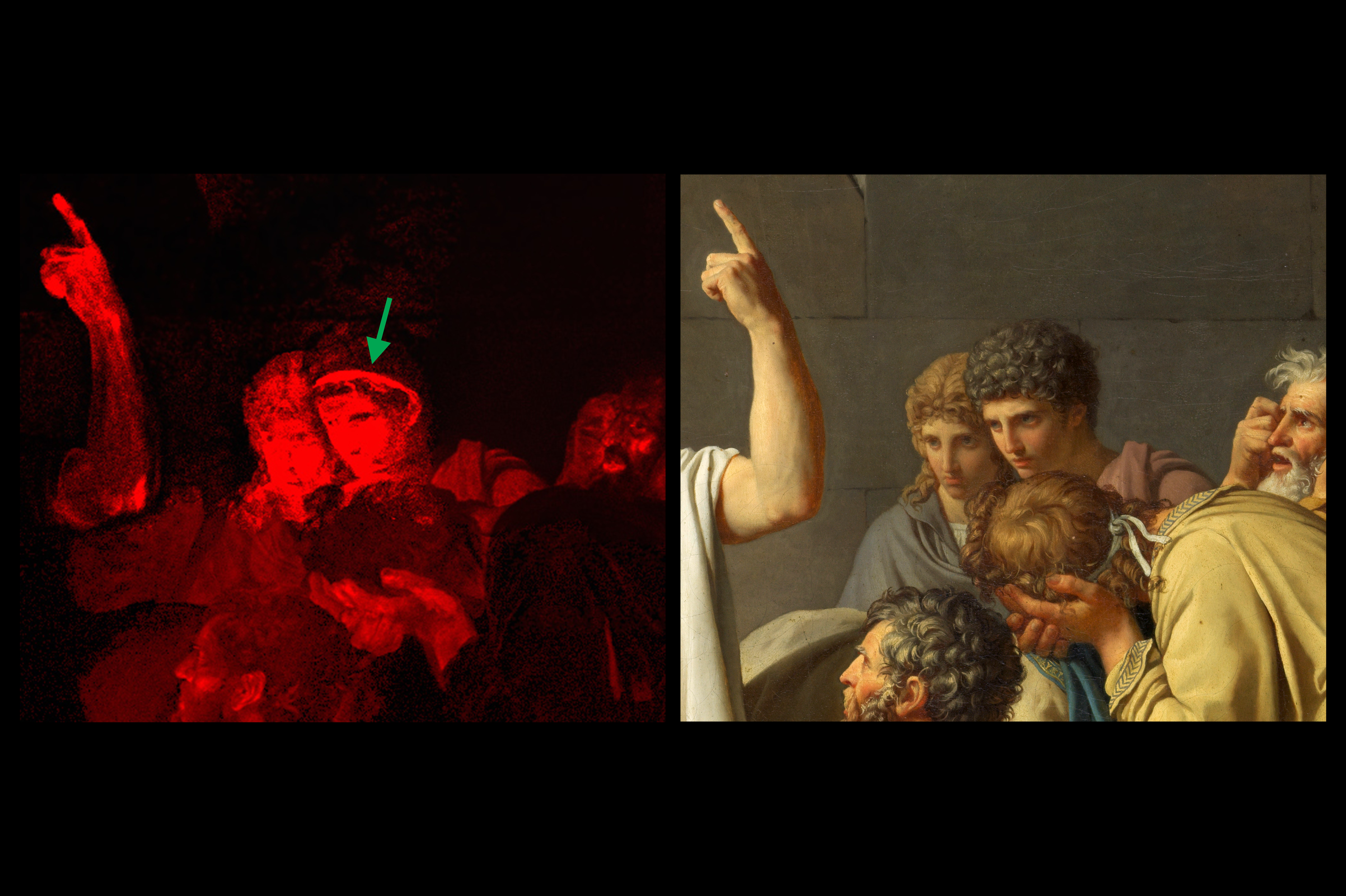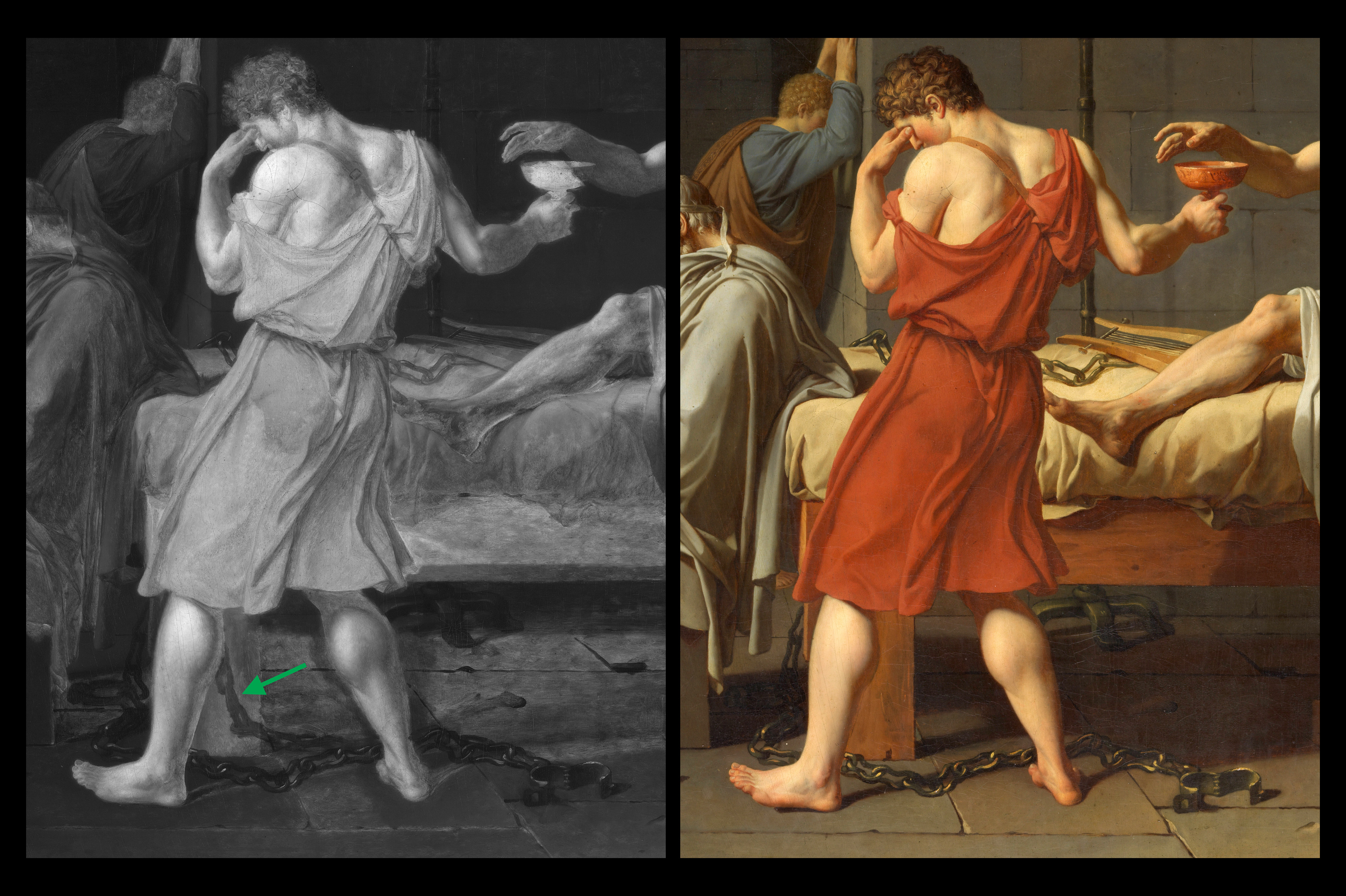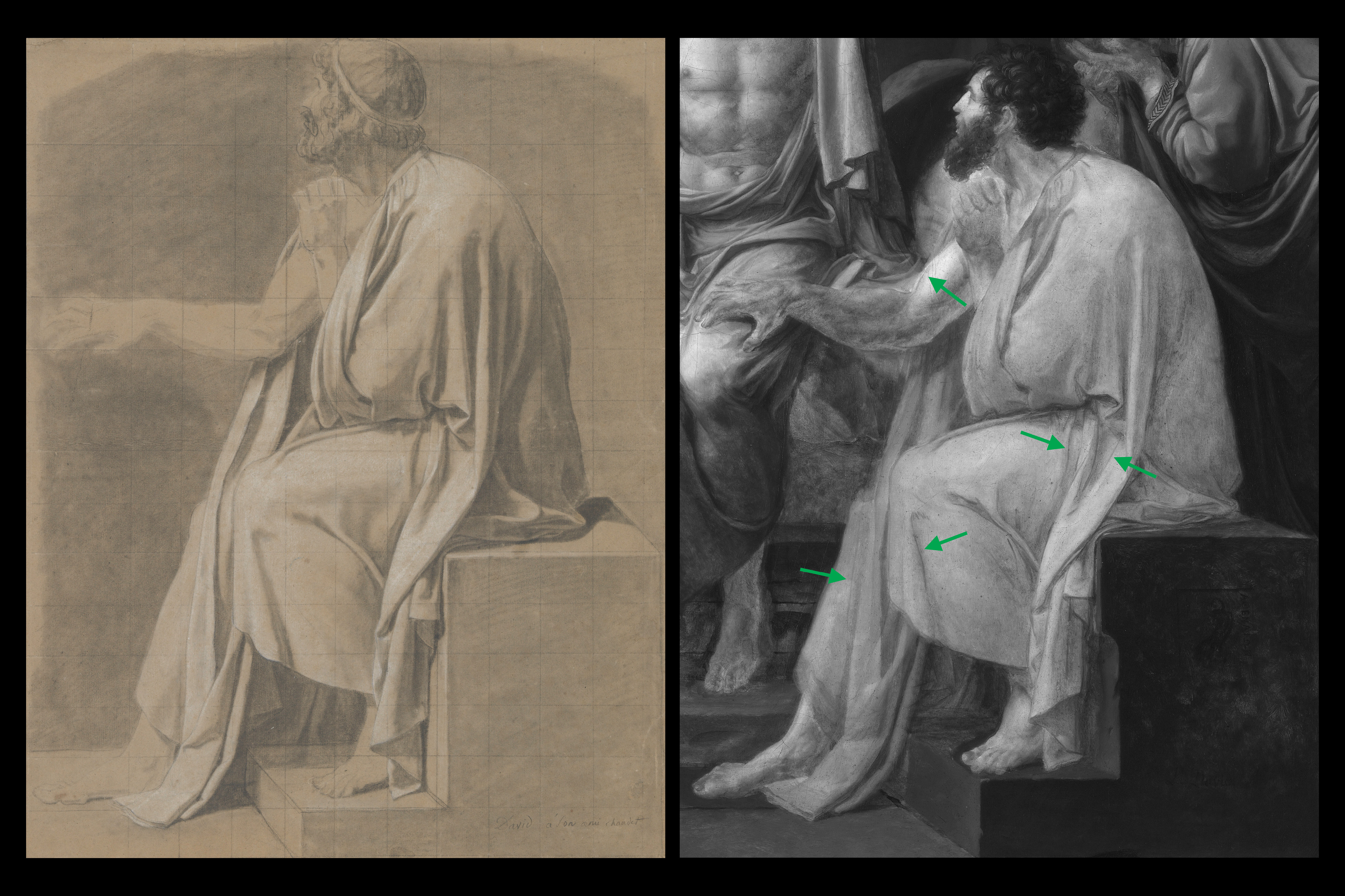 In The Death of Socrates, infrared imaging allowed us to see through the paint layers to the carbon-containing underdrawing—including contours, details, and folds in the drapery—made with fine, black, painted lines.