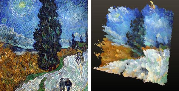 Left: Vincent van Gogh (1853–1890). Country road in Provence by night, circa 1890. Oil on canvas; 90, 6 x 72 cm. Kröller-Müller Museum, The Netherlands. Right: A screenshot of a 3D mesh produced with Dynamic Colors. Image courtesy of the author