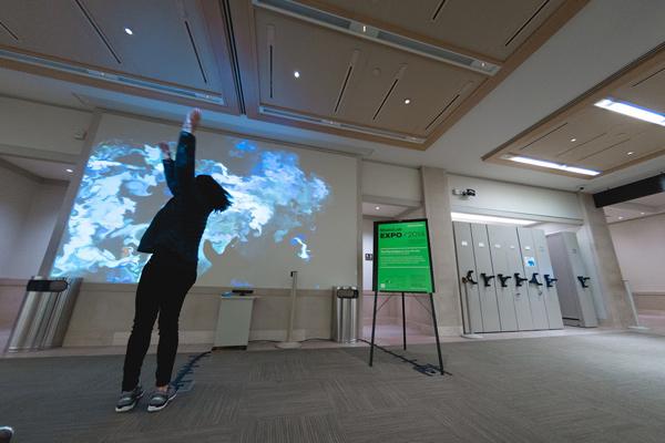 With the help of Paul Caro, Senior Manager of Media Production and Technology Services, and Don, I installed Flow Brushes in Carson Family Hall for the fall 2014 MediaLab Expo. It was powered by a hidden Mac Mini and a Kinect, both of which were placed on a small table facing the audience. Carson Family Hall is very spacious and visually striking, and it's also easily accessible from the Met's 81st Street entrance, so it immediately became a popular attraction, especially for kids.