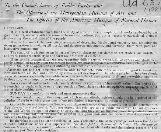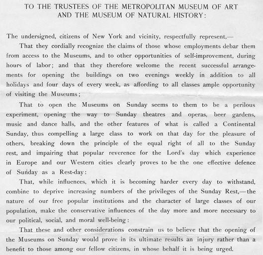 Winifred E. Howe examines the Sunday admission controversy at the Museum in A History of The Metropolitan Museum of Art (1913). As early as 1871, one year after the Museum's founding, some fundraising materials included the following pledge: "It is not the intention of the promoters of The Metropolitan Museum of Art ever to open the same on Sundays as a place of amusement. It is distinctly understood that your subscription . . . is made on that condition."[2]