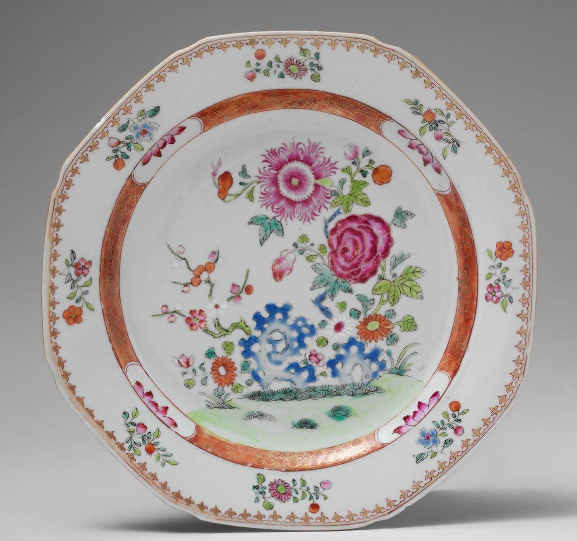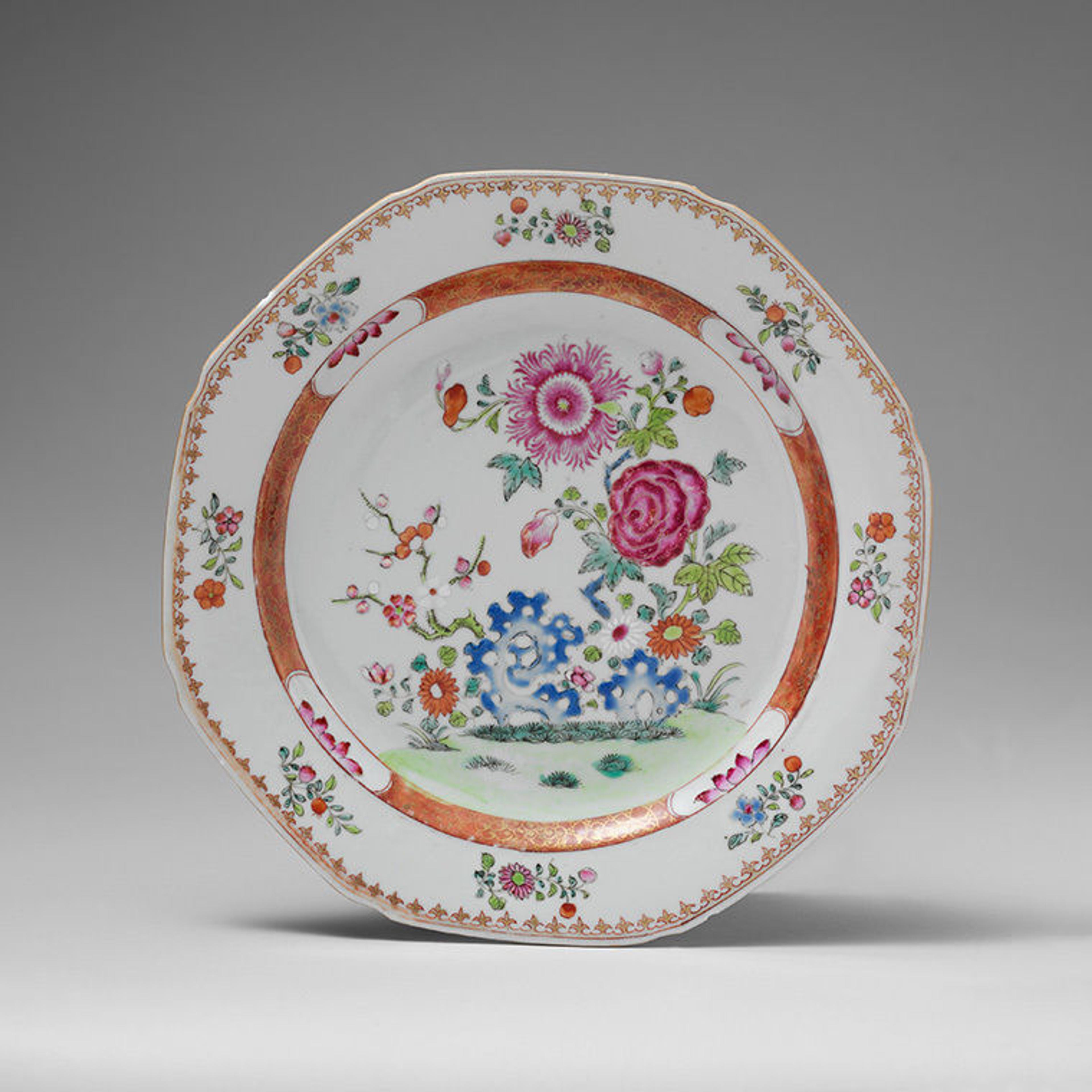 This plate, which features red and pink floral motifs common in export porcelain, travelled to colonial New York during the second half of the eighteenth century. It was part of a large service that was passed down for generations, illustrating the sustained history of exchange between the United States and East Asia.