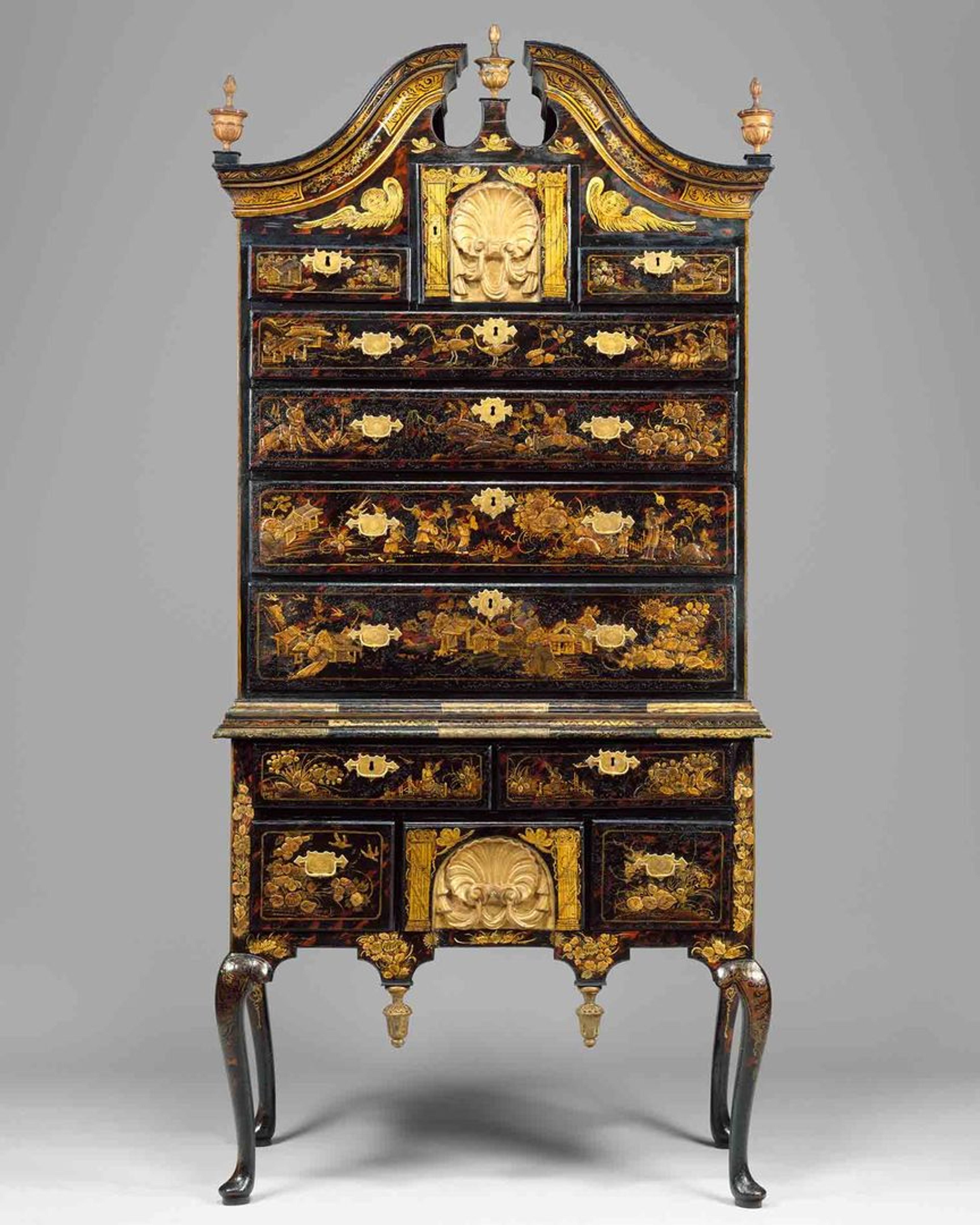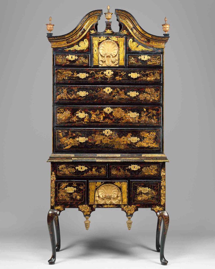 This high chest of drawers uses Japanning to translate a popular form from colonial Massachusetts into the cosmopolitan visual language of Anglo-American Salem. It was passed down for generations in the Pickman family.